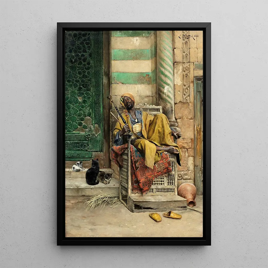 En esta obra, Ludwig Deutsch nos transporta a un universo oriental lleno de colores y detalles. La impresión artística "Le Fumeur de goza" representa a un hombre sentado, sumido en la contemplación de una pipa de agua, rodeado de objetos típicos de la cultura oriental. Los tonos cálidos del ocre y del rojo se combinan armoniosamente, creando una atmósfera a la vez íntima y relajante. La técnica de Deutsch, que combina precisión y sensibilidad, permite sentir la profundidad de las emociones del personaje, al mismo tiempo que resalta las texturas de los textiles y accesorios. Esta obra es una verdadera invitación a descubrir un mundo fascinante.