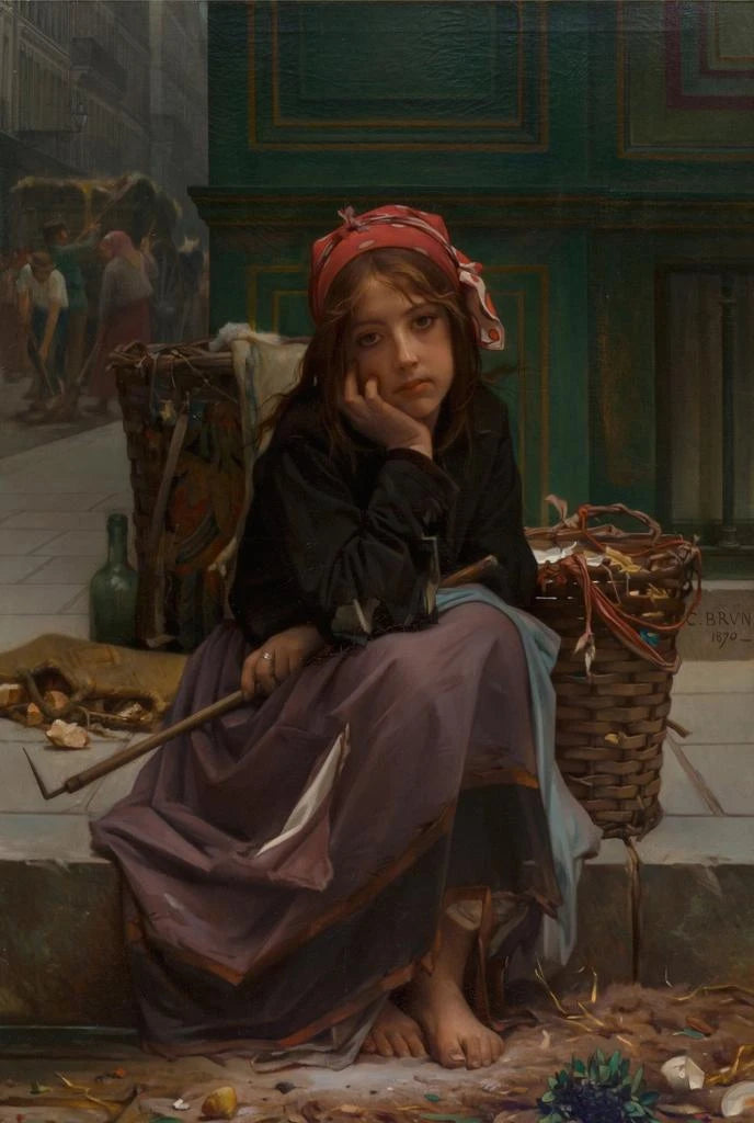 Guillaume Charles Brun, figura emblemática del siglo XIX, se inscribe en la línea de los artistas realistas que buscan representar la vida tal como es. Influenciado por las transformaciones sociales y económicas de su tiempo, se interesa especialmente por las clases populares y sus luchas. Sus obras, entre ellas "La joven vendedora de trapos", reflejan una profunda humanidad y una voluntad de dar voz a quienes a menudo son invisibles. A través de su arte, Brun contribuye a una toma de conciencia social, convirtiéndolo en un actor importante de su época.