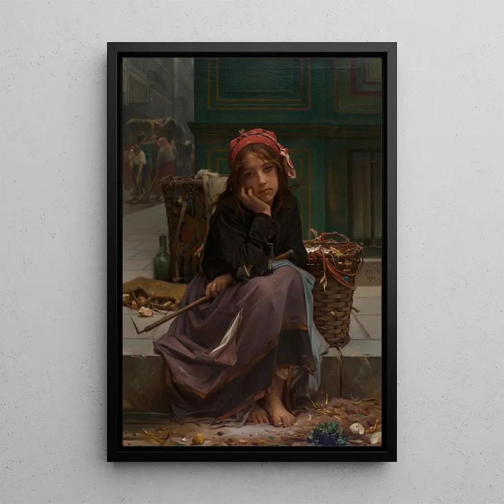 En "La joven vendedora de trapos", Guillaume Charles Brun nos sumerge en una escena de la vida cotidiana, donde una joven, con una mirada decidida, intenta vender sus mercancías. Los colores vibrantes y los detalles precisos del lienzo evocan la energía y la vitalidad de la juventud, al mismo tiempo que resaltan la dura realidad de su existencia. La composición destaca el contraste entre la inocencia de la infancia y los desafíos del mundo adulto. La técnica de Brun, combinando realismo y expresividad, hace que este instante sea a la vez conmovedor y revelador de las luchas sociales de su época.