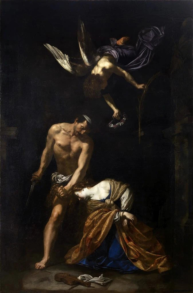 El Martyre de Sainte Cécile, obra de Orazio Riminaldi, representa con intensidad dramática el sufrimiento de la santa, rodeada de una luz suave que acentúa su expresión de serenidad frente a la adversidad. La composición está cuidadosamente orquestada, con figuras dispuestas de manera que guían la mirada hacia el rostro de Sainte Cécile, símbolo de fe y valentía. Los colores cálidos, combinando tonos dorados y rojos profundos, crean una atmósfera a la vez trágica y trascendente, invitando al espectador a reflexionar sobre el sacrificio y la espiritualidad.