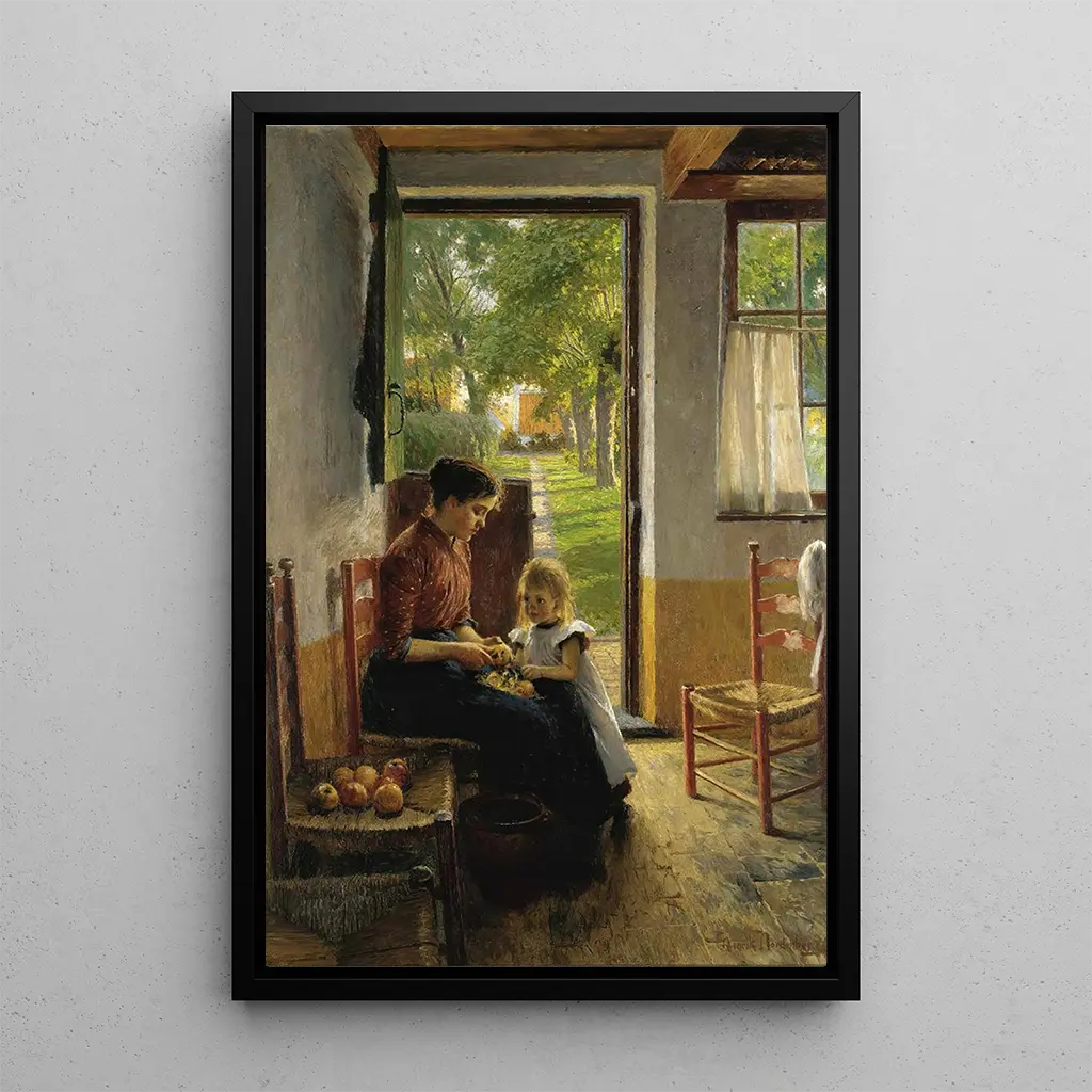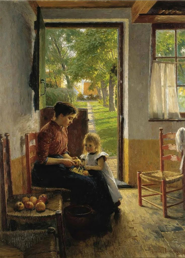 En "El pequeño asistente de mamá", Henrik Nordenberg captura la dulzura de la infancia a través de una composición delicada. La pintura representa a un joven niño, concentrado en sus tareas, rodeado de una paleta de colores cálidos y tranquilizadores. Las tonalidades de marrón y amarillo crean una atmósfera acogedora, mientras que la luz suave que ilumina el rostro del pequeño protagonista evoca una sensación de serenidad. La técnica de Nordenberg, que combina realismo y impresiónismo, permite sentir la ternura del momento, como si se pudieran escuchar los susurros de la infancia y las risas lejanas.