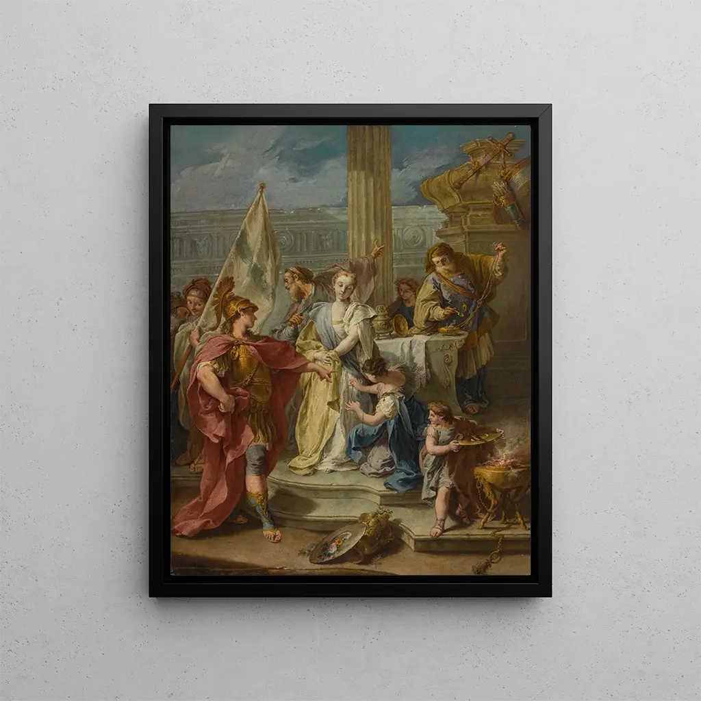 En el corazón de la historia del arte, algunas obras trascienden su época para convertirse en testigos atemporales de la condición humana. "La sacrificio de Políxene" de Giovanni Battista Pittoni es una de esas creaciones que, por su intensidad dramática y su riqueza narrativa, capturan la atención y la imaginación de los amantes del arte. Este lienzo, impregnado de emociones conmovedoras, evoca un momento trágico de la mitología griega, donde Políxene, hija del rey Príamo, es ofrecida en sacrificio para apaciguar a los dioses. A través de esta pintura, Pittoni nos transporta a un universo donde la belleza y el sufrimiento se entrelazan, revelando así la profundidad del alma humana.