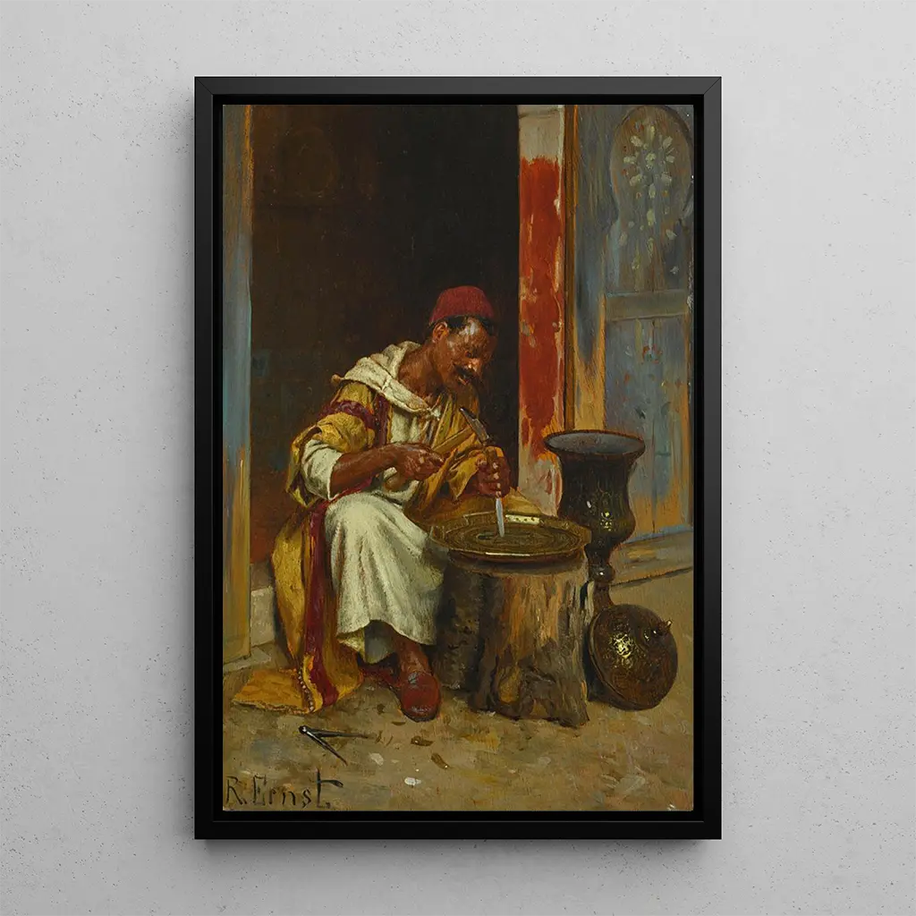 Rudolf Ernst, pintor de origen austriaco, es reconocido por sus obras orientalistas que capturan la magia y el exotismo de las culturas orientales. Activo a finales del siglo XIX, se inspira en los viajes y en los relatos del Oriente, traduciendo esas experiencias en cuadros ricos en detalles y en colores. Su formación en la Academia de Bellas Artes de Viena y sus influencias variadas, que van desde el realismo hasta el romanticismo, le permiten desarrollar un estilo único. "Le Travailleur du laiton" ilustra perfectamente su talento para representar la vida cotidiana y los oficios tradicionales, al tiempo que ofrece una ventana a un mundo fascinante, a menudo desconocido para el público occidental.