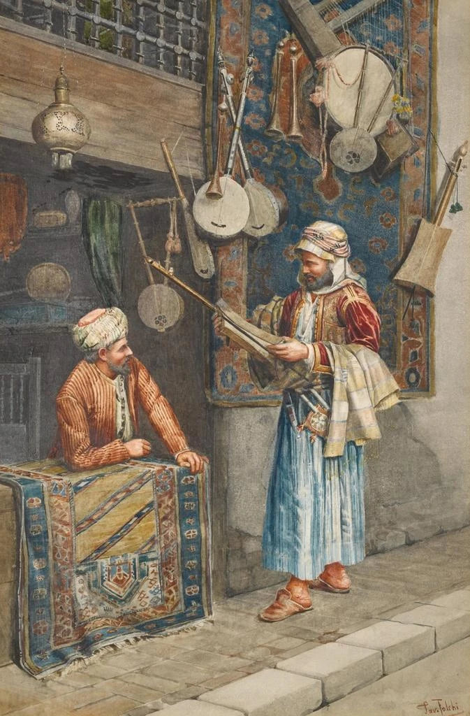 El Vendedor de instrumentos musicales, obra de Paolo Folchi, captura una escena animada donde la música y la vida cotidiana se encuentran. La pintura representa a un comerciante rodeado de instrumentos variados, desde violines hasta flautas, creando un ambiente alegre y festivo. Los colores vivos y los detalles minuciosos de los instrumentos llaman la atención y evocan una atmósfera de convivialidad. La técnica de Folchi, caracterizada por toques de pincel dinámicos, da vida a esta escena, haciendo casi audible la melodía que podría emanar de ella.