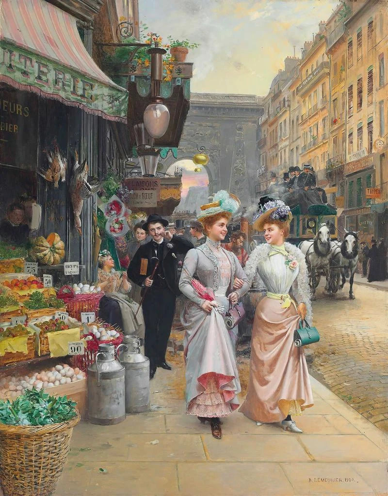 La obra de Basile Lemeunier se distingue por su estilo único, una mezcla sutil de realismo e impresionismo. Los colores vibrantes y las texturas delicadas se combinan para crear una atmósfera a la vez viva y relajante. En "Elegantes en paseo", los personajes están representados con una atención especial a los detalles vestimentarios, destacando la moda de una época pasada. Los vestidos ligeros y los sombreros adornados con flores parecen bailar con la brisa, mientras que el fondo difuso evoca un paisaje urbano lleno de dulzura. Esta obra no se limita a representar una escena; evoca una emoción, una sensación de libertad y ligereza, incitando al espectador a sentir la belleza del momento. La composición, cuidadosamente equilibrada, atrae la mirada e invita a una contemplación prolongada, revelando así la profundidad y la riqueza del universo artístico de Lemeunier.