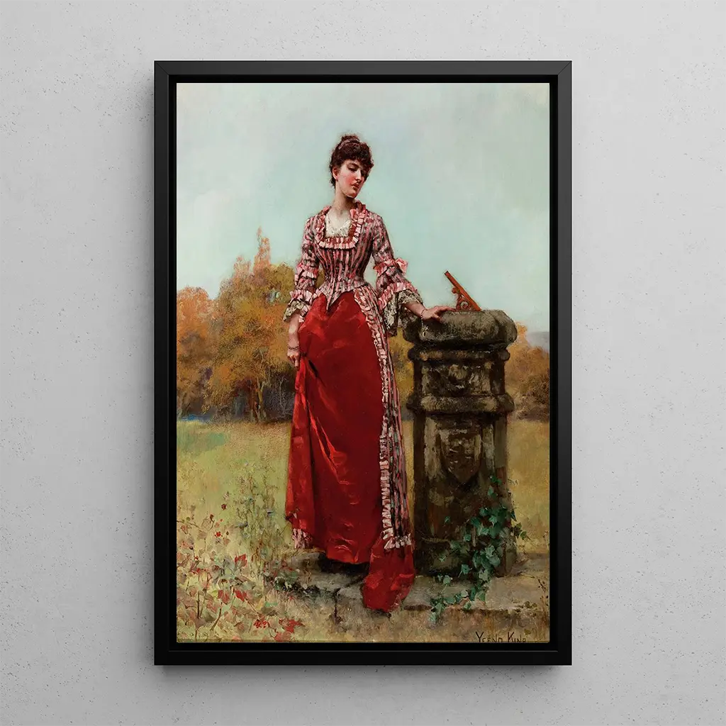 Henry John Yeend King, activo a finales del siglo XIX, es reconocido por sus paisajes llenos de poesía y luz. Influenciado por el movimiento prerrafaelita, supo capturar la belleza de la naturaleza con una sensibilidad única. Sus obras, a menudo centradas en temas bucólicos, reflejan el ideal victoriano de armonía entre el hombre y su entorno. "En el reloj de sol" ilustra perfectamente esta búsqueda de evasión y belleza, además de evidenciar la importancia de la naturaleza en el arte de esa época. King dejó su huella en su tiempo con un estilo distintivo y un enfoque refinado de la pintura.