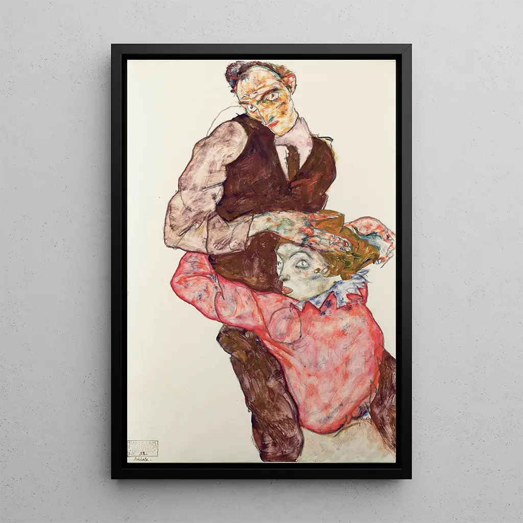 En "Amoureux", Egon Schiele captura la intensidad de las emociones humanas a través de una composición audaz y colores vibrantes. Las figuras, a menudo deformadas, están envueltas en una atmósfera a la vez íntima y perturbadora. Los rasgos expresivos y las líneas fluidas reflejan la maestría de Schiele en el arte de la representación del cuerpo humano. La obra evoca una tensión palpable entre el amor y el sufrimiento, haciendo que el espectador sea testigo de una danza emocional compleja. El uso de tonos cálidos y contrastes marcados acentúa la intensidad de la escena, invitando a una contemplación profunda de las relaciones humanas.