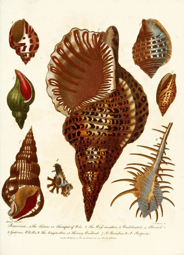 John Chapman, un ilustrador y naturalista del siglo XVIII, marcó su época con sus representaciones precisas de la fauna y la flora. Influenciado por los descubrimientos científicos de su tiempo, supo combinar arte y ciencia, haciendo que sus obras sean tanto educativas como estéticas. La importancia de Chapman radica en su capacidad para documentar la biodiversidad marina, contribuyendo así al conocimiento de los moluscos. Sus ilustraciones, como las de la Encyclopaedia londinensis, se han convertido en referencias para los aficionados a las ciencias naturales y los artistas, testimoniando el entusiasmo por la conchología en esa época.