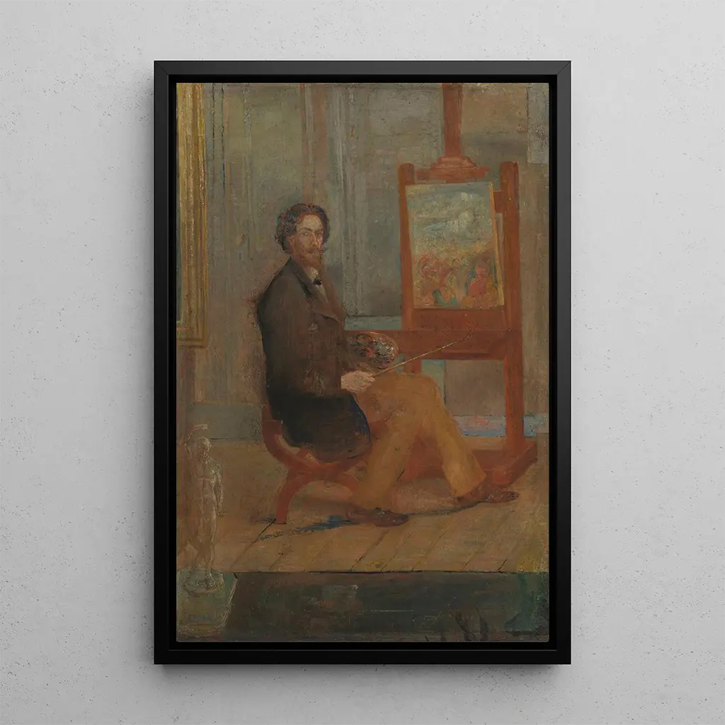 La impresión artística de Ensor en su caballete nos ofrece una visión cautivadora del artista en pleno proceso creativo. Este cuadro, rico en colores y texturas, representa un momento de introspección donde el artista parece dialogar con su obra. Los tonos vivos y las formas expresivas reflejan la energía creativa de Ensor, mientras que su mirada concentrada revela la pasión que lo anima. La atmósfera de este cuadro es a la vez íntima y dinámica, invitando al espectador a compartir este momento único del acto artístico.