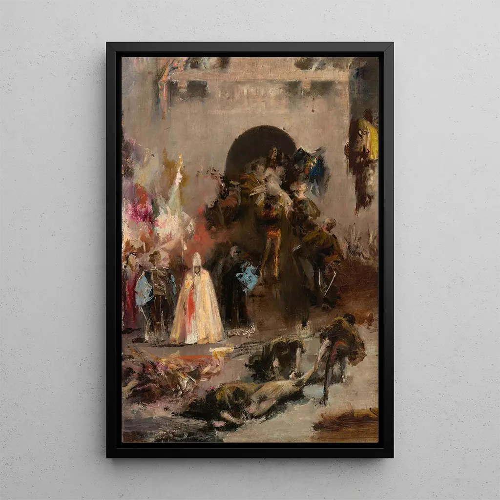 La impresión artística de Escena de la Inquisición española, realizada por Henri Regnault, sumerge al espectador en un momento de tensión y tragedia. Esta obra, pintada en 1870, ilustra una escena cargada de emoción, donde la luz y la sombra juegan un papel crucial en la narración visual. Los colores oscuros y terrosos, mezclados con destellos de luz, acentúan el drama que se desarrolla ante nuestros ojos. Regnault, con su técnica cuidada, logra hacer palpable la angustia de los personajes, creando así una atmósfera a la vez opresiva y cautivadora. Cada detalle, desde las expresiones faciales hasta los trajes, refleja su preocupación por el realismo.
