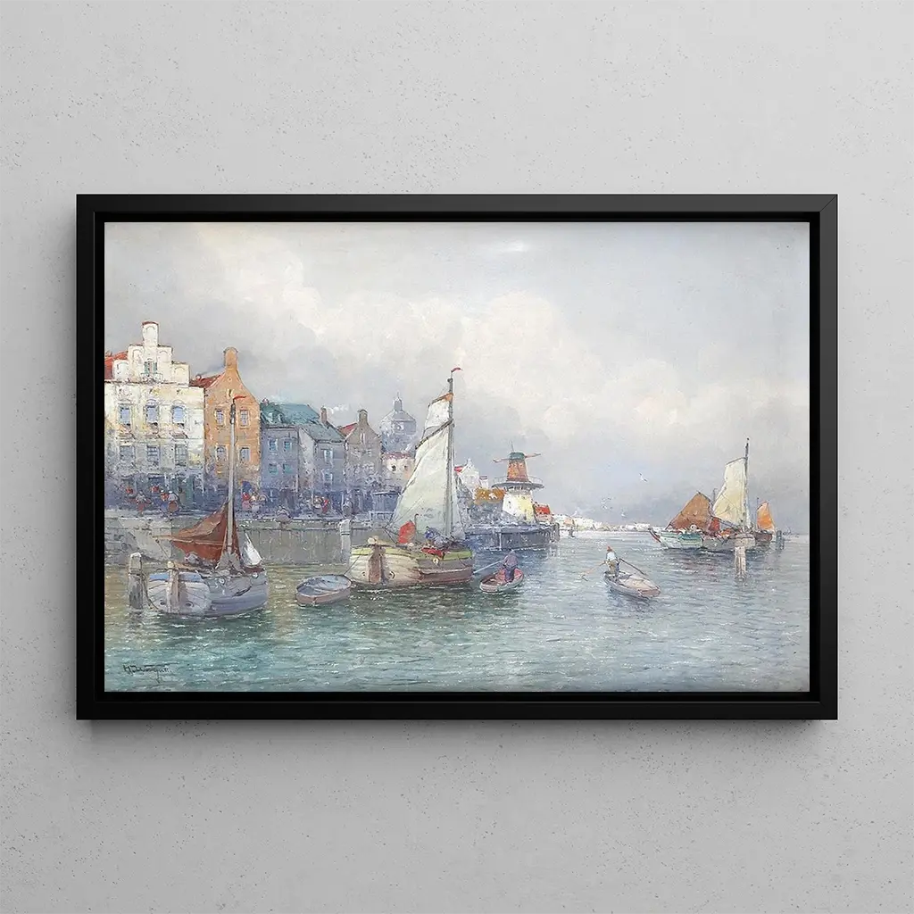 Escena del puerto holandés : una danza de luz y vida La impresión artística de la Escena del puerto holandés nos sumerge en un cuadro vibrante, donde las tonalidades de azul y verde se mezclan armoniosamente. Las velas blancas de los barcos se destacan sobre el agua reluciente, mientras que los personajes, vestidos con trajes de época, se ocupan en el muelle. La técnica de Georg Fischhof, que emplea pinceladas delicadas, crea una atmósfera viva y dinámica, casi palpable. Este cuadro evoca no solo un momento congelado en el tiempo, sino también la efervescencia de un puerto en plena actividad, invitando al espectador a imaginar las historias que se esconden detrás de cada rostro. Georg Fischhof : un maestro del realismo marítimo Georg Fischhof, pintor austríaco del siglo XIX, es reconocido por sus obras marítimas que capturan la esencia de la vida portuaria. Influenciado por el movimiento realista, supo transcribir con precisión los detalles de la vida cotidiana, integrando además una dimensión poética a sus composiciones. Fischhof ha explorado frecuentemente los temas del mar y los puertos, testimoniando la importancia de estos lugares en el comercio y la cultura de su época. Su estilo, marcado por una atención minuciosa a los detalles y una paleta rica, lo convierte en un artista imprescindible para quienes se interesan en el arte marítimo. Una adquisición decorativa con múltiples ventajas Optar por la impresión artística de la Escena del puerto holandés, es elegir un lienzo que aportará un toque de elegancia a su interior. Ya sea en una sala de estar, una oficina o un dormitorio, esta obra sabrá captar las miradas y suscitar conversaciones. Su calidad de impresión garantiza una fidelidad a los colores y detalles del original, ofreciendo además un atractivo estético indudable. Al integrar esta impresión artística en su decoración, no solo añade una pieza de arte, sino también una ventana a un mundo marítimo lleno de historia y vida.