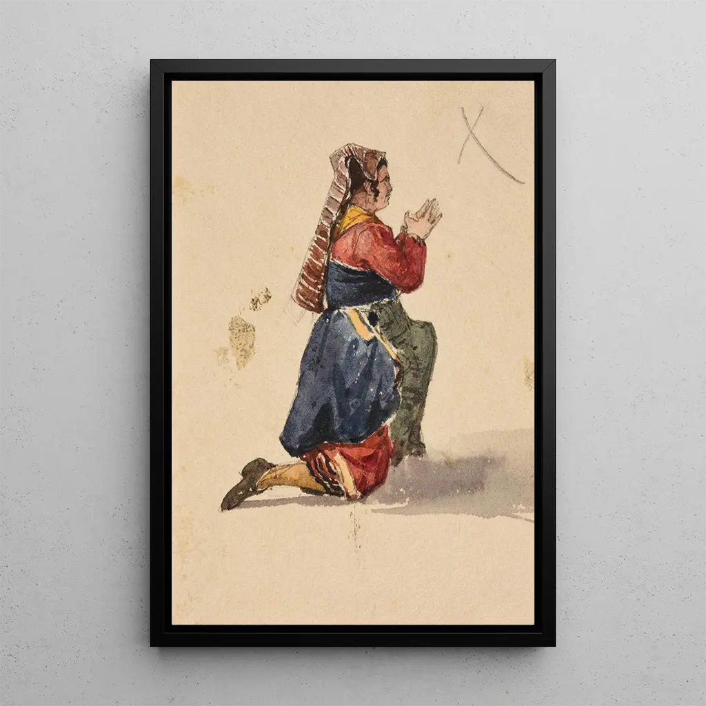 La obra "Estudio de mujer arrodillada" de Jacques-Raymond Brascassat representa una figura femenina en una pose llena de dulzura y serenidad. Las curvas delicadas y los detalles minuciosos del vestido resaltan la belleza y la fragilidad de la feminidad. La paleta de colores elegida por el artista, con tonos cálidos y relajantes, crea una atmósfera íntima y contemplativa. Este lienzo invita a reflexionar sobre la condición femenina, al mismo tiempo que celebra la gracia y la elegancia de su sujeto, capturando un momento de vulnerabilidad y fuerza.