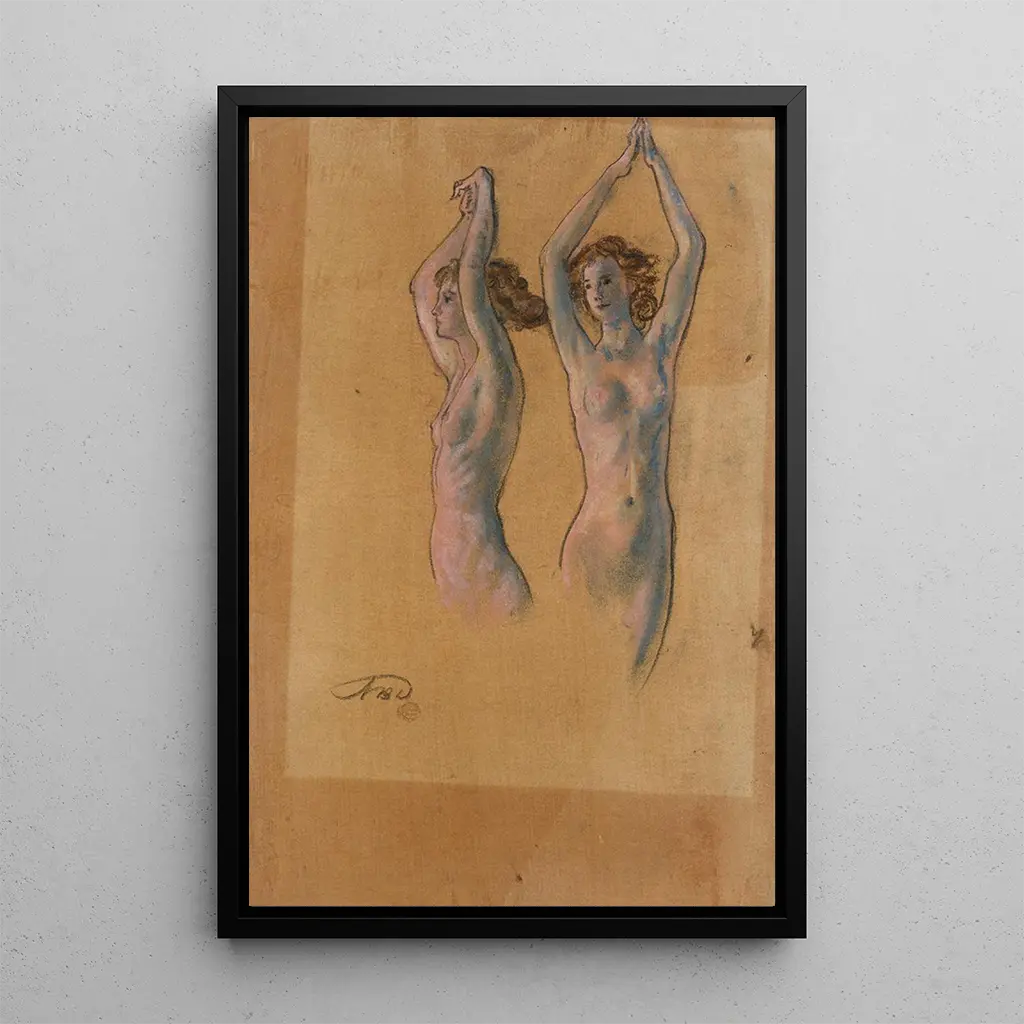 Los Estudios de desnudo de Arthur Bowen Davies son una celebración de la forma humana, capturando la gracia y la sensualidad a través de líneas fluidas y sombras delicadas. La paleta de colores, a menudo suave y matizada, evoca una atmósfera a la vez íntima y contemplativa. Cada figura parece vibrar de vida, invitando al espectador a una reflexión sobre la belleza y la vulnerabilidad del ser humano. La técnica del artista, combinando pintura al óleo y toques de luz, crea un juego fascinante entre sombra y luz, reforzando el impacto emocional de la obra.