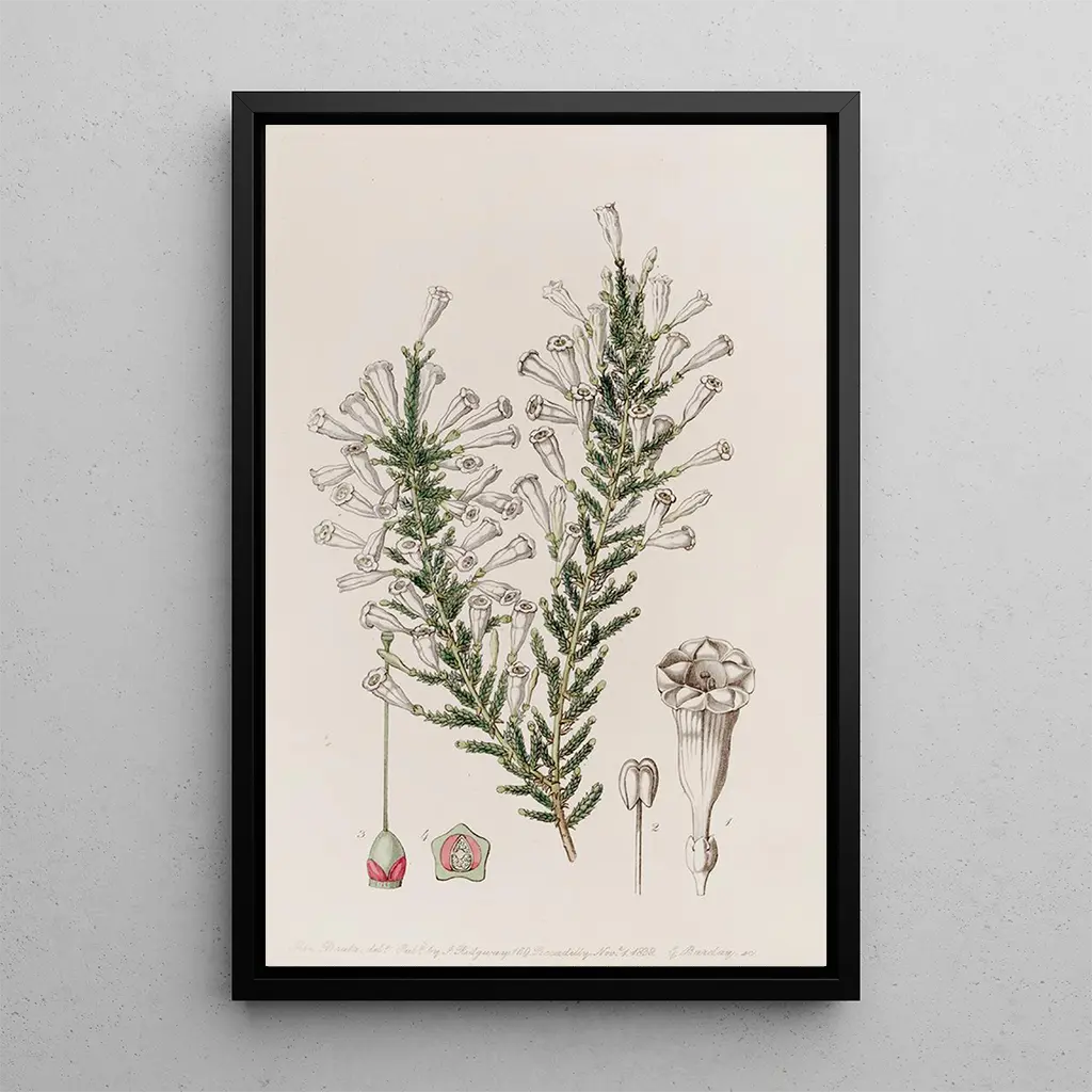 La impresión artística Fabiana imbriquée de Sydenham Edwards es una obra que evoca la delicadeza y la riqueza de la naturaleza. Los tonos vibrantes de verde y rosa se entrelazan para crear una composición armoniosa, donde cada detalle parece cobrar vida. La técnica de acuarela, utilizada con maestría, aporta ligereza a la totalidad, mientras que los contornos precisos de las flores resaltan su belleza efímera. Este lienzo invita a la contemplación, transportando al espectador a un jardín exuberante donde la flora florece en toda su esplendor.