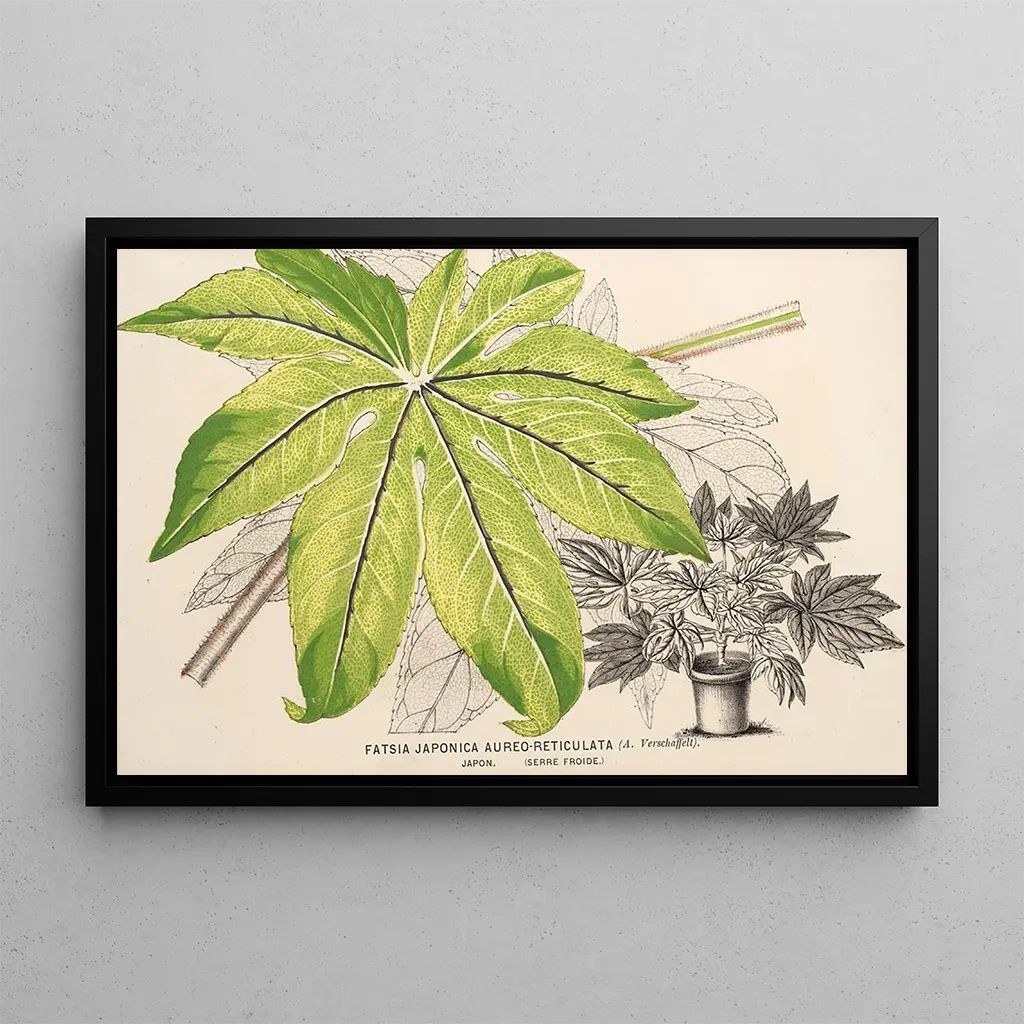 La impresión artística Fatsia japonica aureoreticulata nos sumerge en un universo vegetal fascinante, donde las hojas anchas y recortadas se entrelazan en una armonía de verdes vibrantes. Las tonalidades doradas que puntúan las nervaduras de las hojas añaden una dimensión luminosa, evocando los rayos del sol filtrándose a través de un follaje exuberante. Esta obra, a la vez realista y poética, captura la esencia misma de la naturaleza, invitando a la contemplación y a la serenidad. La técnica del artista, que juega con la luz y la sombra, crea una atmósfera relajante, ideal para embellecer un espacio de vida.