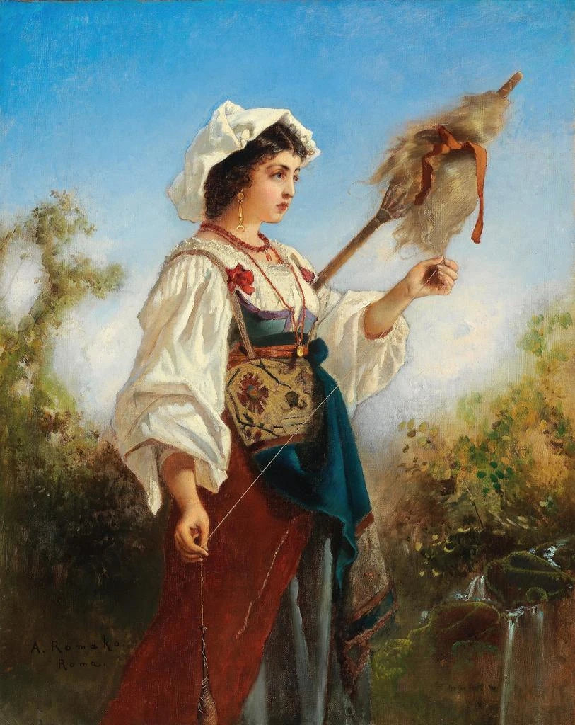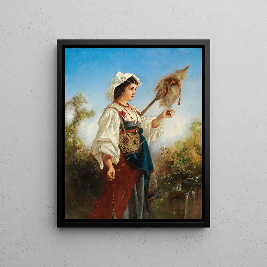 Reproducción Fileuse romana - Anton Romako – Introducción cautivadora En el vasto panorama de la historia del arte, algunas obras resuenan con una intensidad particular, capturando no solo la imaginación de los espectadores, sino también la esencia de una época. "Fileuse romaine" de Anton Romako es una de esas creaciones que trascienden el simple marco de una pintura para convertirse en una inmersión en el universo de la Roma antigua. A través de esta obra, el artista nos transporta a un momento suspendido, donde el tiempo parece detenerse para dar paso a la contemplación. La escena representa a una hiladora en acción, símbolo de la vida cotidiana y del trabajo femenino, mientras evoca una belleza atemporal. Esta pintura, por su realismo y profundidad, invita a reflexionar sobre el papel de las mujeres en la sociedad antigua, al mismo tiempo que celebra el arte de la hilatura, un saber hacer esencial en la época. Estilo y singularidad de la obra El estilo de Anton Romako se distingue por su atención minuciosa a los detalles y su capacidad para capturar la luz de manera impactante. En "Fileuse romaine", la paleta de colores elegida por el artista evoca una atmósfera cálida, casi íntima. Los tonos terrosos, combinados con destellos de luz, crean un ambiente que parece vibrar con una vida propia. La composición está cuidadosamente equilibrada, destacando la figura de la hiladora mientras integra elementos de su entorno que enriquecen la narración visual. La textura de las telas y la representación de los gestos revelan una maestría técnica que testimonia el compromiso de Romako con su arte. Cada pincelada parece cargada de significado, y la obra en su conjunto se revela como una oda a la belleza cotidiana, a la armonía entre el hombre y su trabajo. El artista y su influencia Anton Romako, pintor de origen austriaco, supo imponerse en la escena artística del siglo XIX gracias a su enfoque innovador y a su sensibilidad frente a los temas que elegía. Influenciado por el realismo y el romanticismo, Romako supo combinar estos movimientos para crear obras que hablan al alma. Su fascinación por la vida de las personas comunes, y en particular por el papel de las mujeres, se refleja en varias de sus creaciones. "Fileuse romaine" encaja perfectamente en esta línea,