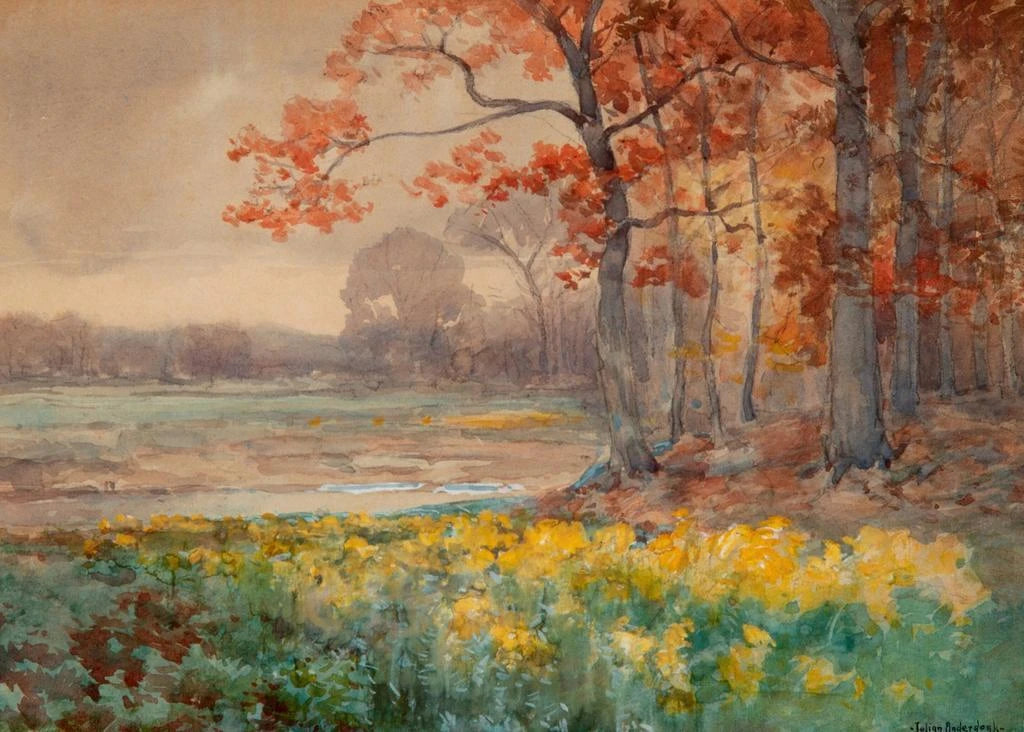 En "Fleurs jaunes par un jour gris", Julian Onderdonk captura la belleza efímera de las flores, contrastando su brillo con el cielo nublado. Esta obra evoca una atmósfera de melancolía suave, donde los tonos amarillos vibrantes de las flores iluminan la pintura, creando un diálogo conmovedor con el fondo oscuro. La técnica del artista, que combina realismo e impresiónismo, permite sentir la textura de los pétalos y la ligereza de los tallos. Cada pincelada parece respirar vida, al mismo tiempo que recuerda la fragilidad de la naturaleza, una temática querida por Onderdonk.