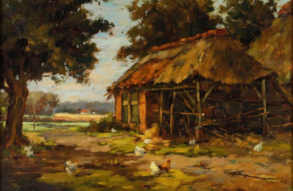 Poules devant une Grange : un tableau bucolique aux colores vivos