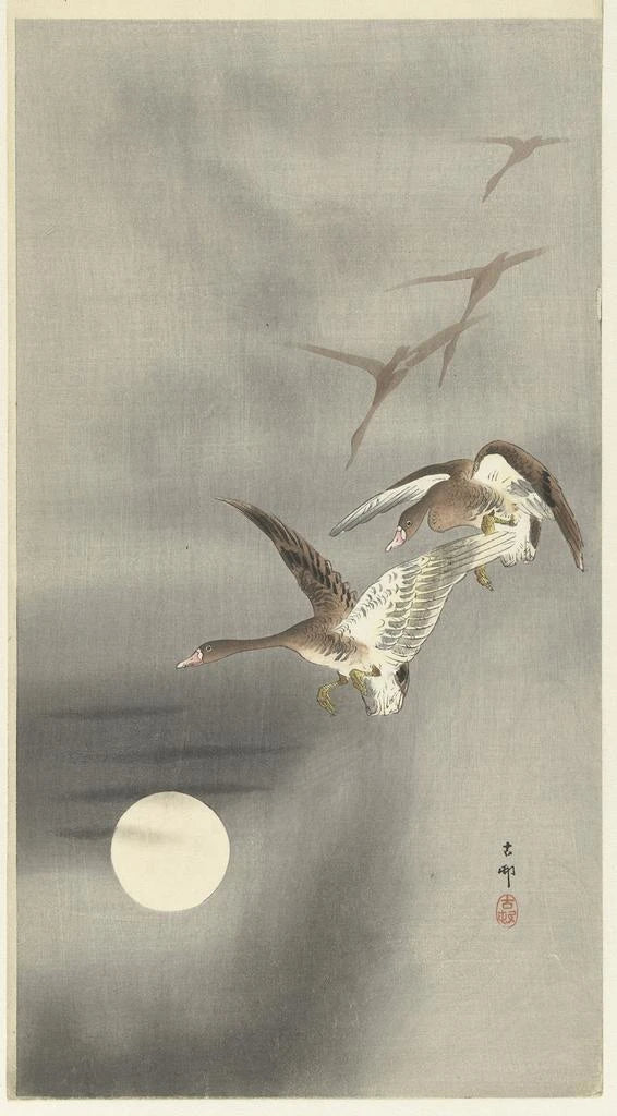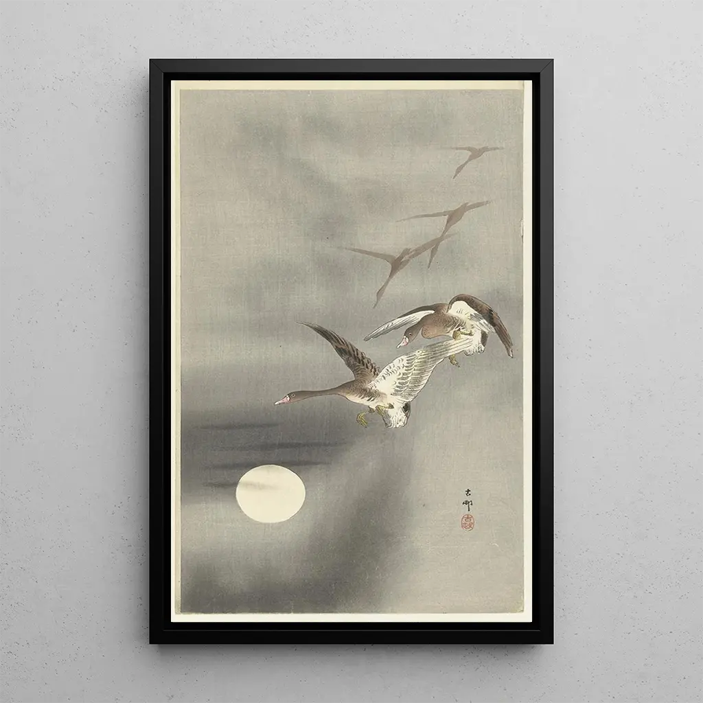 La obra "Oies en vol" de Ohara Koson captura un momento fugaz en la naturaleza, donde majestuosas oies se elevan en el cielo. Las delicadas tonalidades de azul y blanco se combinan armoniosamente, creando una atmósfera serena y poética. La técnica de impresión artística sobre papel, típica del ukiyo-e, permite plasmar la ligereza de los pájaros en pleno vuelo, mientras que los detalles minuciosos de las plumas añaden un toque de realismo. Esta impresión artística evoca una sensación de libertad y paz, invitando al espectador a escapar a un mundo natural encantador.