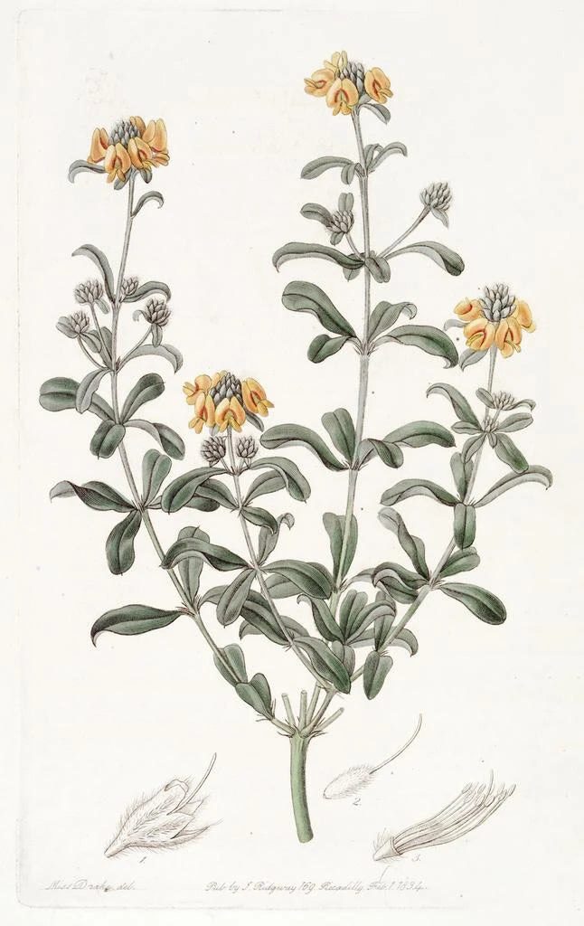 El cuadro "Gastrolobium con hojas romas" de Sydenham Edwards presenta una composición delicada donde los matices de verde se mezclan con toques de amarillo y rojo. Las hojas, con contornos redondeados y romos, se extienden con gracia, creando una atmósfera de serenidad y armonía. La técnica de la acuarela, utilizada con finura, permite capturar la luz natural, dando vida a cada detalle de esta planta fascinante. La obra invita al espectador a una contemplación atenta, revelando la belleza oculta de la flora australiana.