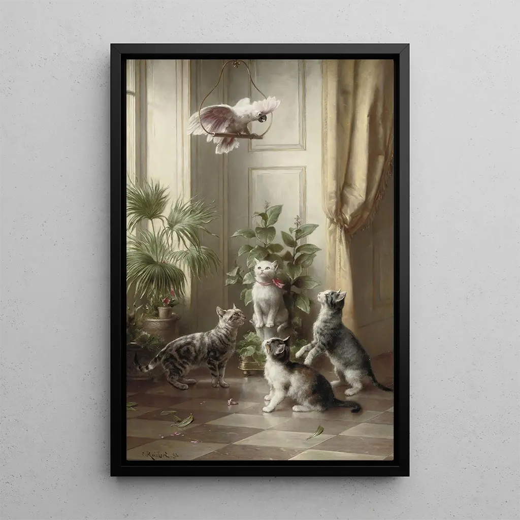 En esta impresión artística de la obra "Chats y el cacatúa", Carl Reichert nos sumerge en un universo donde la dulzura de los felinos encuentra la exuberancia de un ave colorida. Los tonos cálidos y naturales, desde los marrones hasta los dorados, crean una atmósfera relajante. La técnica de Reichert, que combina realismo y finura, permite sentir la textura del pelaje de los gatos y el brillo de las plumas del cacatúa. Cada detalle está cuidadosamente trabajado, invitando al espectador a detenerse en esta escena pacífica donde la naturaleza florece.