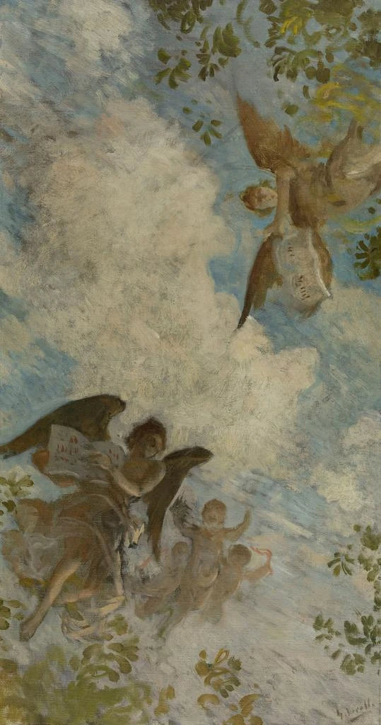 Henry Lerolle, pintor francés del siglo XIX, supo imponerse gracias a su estilo único que combina tradición académica y toques impresionistas. Formado en la École des Beaux-Arts, fue influenciado por maestros como Delacroix y Courbet, lo cual se refleja en sus elecciones de temas y en su técnica. "Génie de las letras" se inscribe en un período donde la cultura literaria y artística estaba en pleno auge, y Lerolle, a través de sus obras, contribuyó a la valorización del intelecto y de la creatividad. Su compromiso con el arte y su exploración de temas intelectuales le permitieron dejar una huella duradera en el panorama artístico francés.