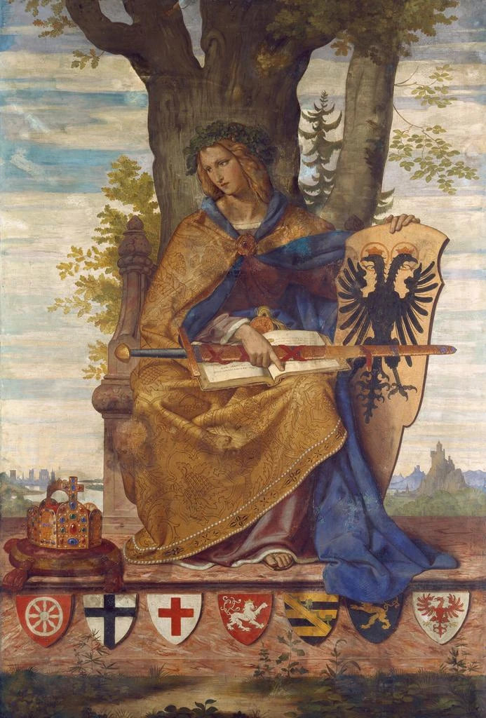 En la obra Germania, Philipp Veit nos sumerge en el corazón de una representación simbólica de Alemania. La composición está dominada por colores vivos y contrastes impactantes, donde el rojo, el negro y el oro se mezclan armoniosamente. La figura central, majestuosa y femenina, encarna el espíritu nacional, rodeada de elementos naturales que evocan la riqueza del paisaje germánico. La técnica de Veit, combinando romanticismo con influencias neoclásicas, crea una atmósfera a la vez solemne e inspiradora, invitando al espectador a reflexionar sobre la identidad y la historia.
