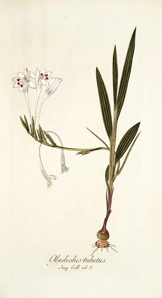 Nikolaus Joseph Freiherr von Jacquin, botánico y artista del siglo XVIII, supo fusionar arte y ciencia de manera innovadora. Formado en Viena, fue influenciado por los descubrimientos botánicos de su época, buscando inmortalizar la belleza de las plantas a través de sus obras. Gladiolus tubatus es un ejemplo perfecto de su enfoque, donde combina una representación fiel de las flores con una estética refinada. Su trabajo no solo enriqueció el mundo del arte, sino que también contribuyó al avance del conocimiento botánico, convirtiéndolo en un pionero en este campo.