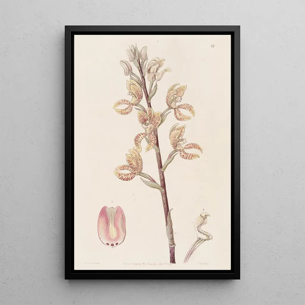 La impresión artística de Govenia de Linden, realizada por Sydenham Edwards, nos sumerge en un universo botánico de gran delicadeza. Los colores pastel se combinan con sutileza, creando una atmósfera relajante y contemplativa. La precisión de los detalles, típica de las ilustraciones botánicas, resalta cada pétalo y cada hoja, revelando la belleza intrínseca de esta planta. La técnica de acuarela, utilizada con maestría, confiere a la obra una ligereza y una transparencia que invitan a la admiración. Esta obra es mucho más que una simple representación; evoca la serenidad de los jardines exuberantes y la riqueza de la naturaleza.