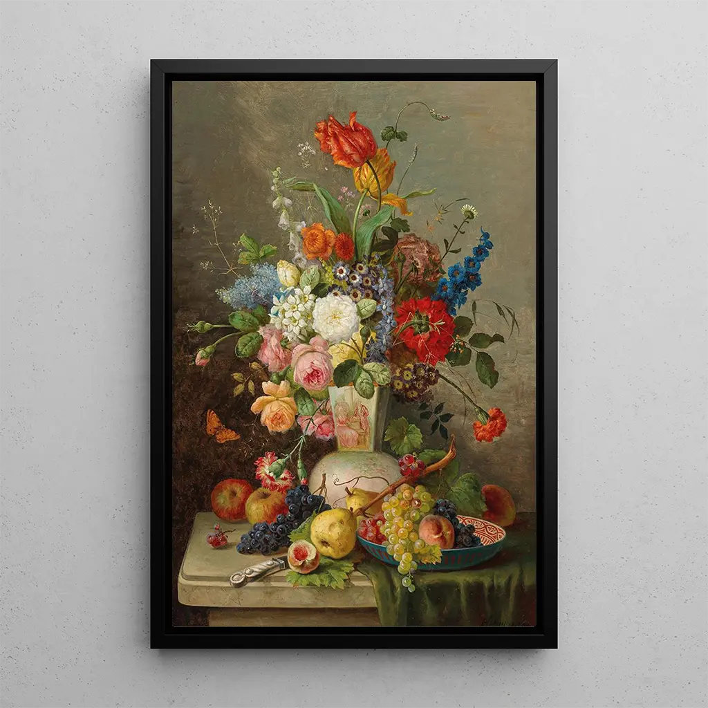 Franz Hohenberger, activo en el siglo XIX, es reconocido por sus naturalezas muertas que capturan la espléndida efímera de la vida. Influenciado por los maestros flamencos, supo desarrollar un estilo que combina precisión y sensibilidad. Su trabajo se distingue por una atención minuciosa a los detalles y una paleta de colores vibrantes que insuflan una vida nueva a composiciones clásicas. El Gran ramo de flores con frutas sobre una losa de piedra es un ejemplo perfecto de su habilidad para transformar elementos ordinarios en obras de arte extraordinarias, demostrando su talento y compromiso con la belleza natural.