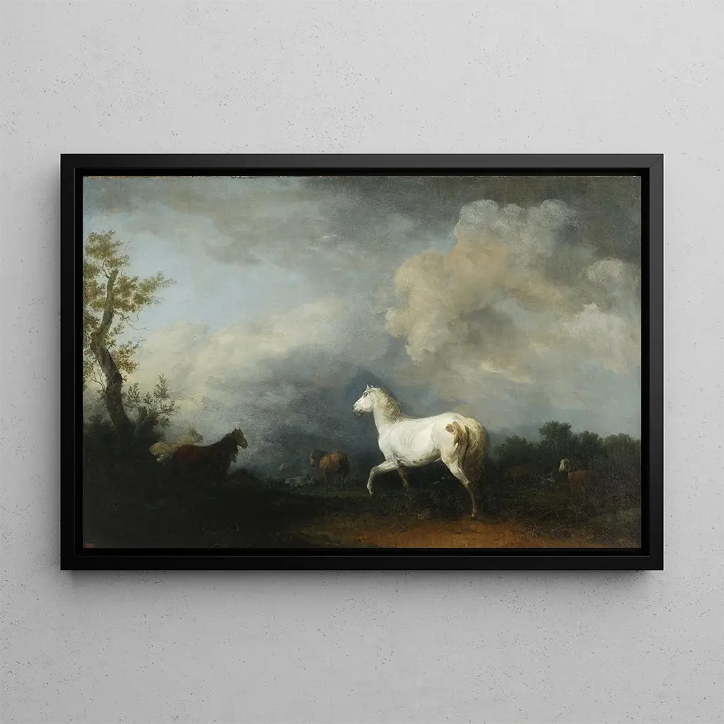 En esta impresión artística de la pintura "Grupo de caballos", Francesco Giuseppe Casanova captura la energía bruta y la belleza majestuosa de los équidos. Los caballos, representados en un movimiento dinámico, parecen casi cobrar vida bajo los golpes de pincel. Los colores terrosos y las tonalidades de marrón y negro se mezclan armoniosamente, creando una atmósfera a la vez salvaje y serena. La técnica de Casanova, que combina realismo e impresionismo, permite al espectador sentir la fuerza y la gracia de estos animales, al tiempo que invita a la contemplación de la naturaleza.