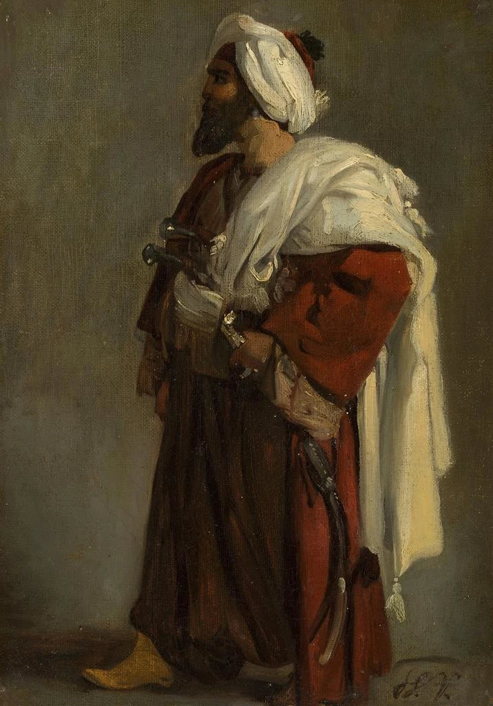 Horace Vernet, nacido en 1789, es un artista francés reconocido por sus representaciones de escenas militares e históricas. Criado en un entorno artístico, fue influenciado por los grandes maestros de su tiempo y supo desarrollar un estilo único, que combina realismo y romanticismo. Vernet viajó por Europa y Oriente Medio, lo que le permitió enriquecer su repertorio visual. "Guerrero árabe" refleja su interés por las culturas orientales y su capacidad para capturar el espíritu guerrero con una precisión notable, convirtiéndolo en un pintor imprescindible del siglo XIX.