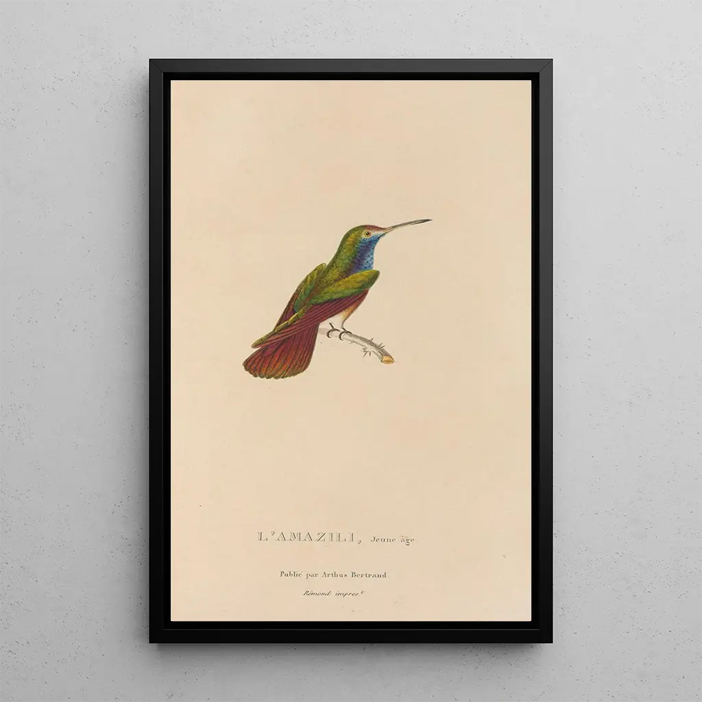 En esta impresión artística de la obra "Historia natural de los colibríes Pl12", René Primevère Lesson nos sumerge en un universo vibrante donde la naturaleza se expresa con brillo. Los colibríes, delicados y gráciles, están representados con una minuciosidad notable. Los colores vibrantes, que van desde verdes esmeralda hasta rojos ardientes, crean una atmósfera casi mágica. La técnica de la acuarela, utilizada con delicadeza, permite capturar la ligereza de estas criaturas aladas, mientras que el fondo sobrio realza su belleza. Esta obra invita a una contemplación atenta, revelando los detalles sutiles de cada plumaje.