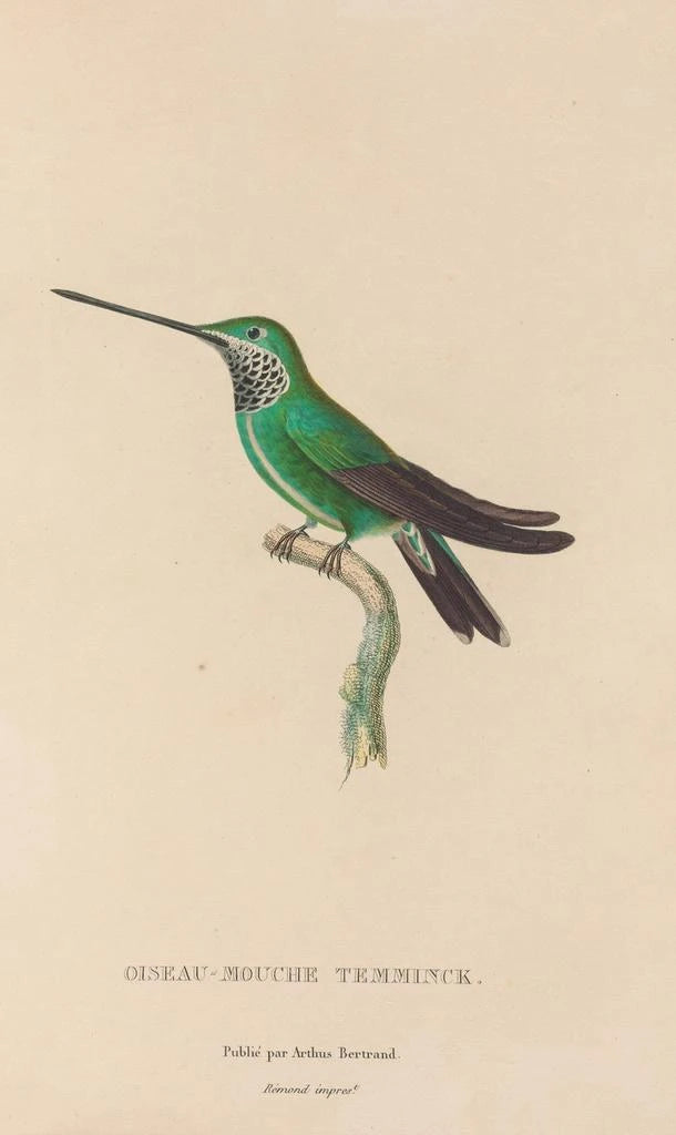 René Primevère Lesson, naturalista e ilustrador francés, marcó el siglo XIX con sus contribuciones a la ornitología. Su enfoque artístico, que combina observación científica y sensibilidad estética, permitió dar a conocer la riqueza aviar a un amplio público. Su obra "Histoire naturelle des oiseaux-mouches" es emblemática de su época, donde la exploración y la documentación de especies eran primordiales. Lesson supo capturar la esencia misma de estas aves, haciendo de sus ilustraciones referencias en el campo de la ornitología.