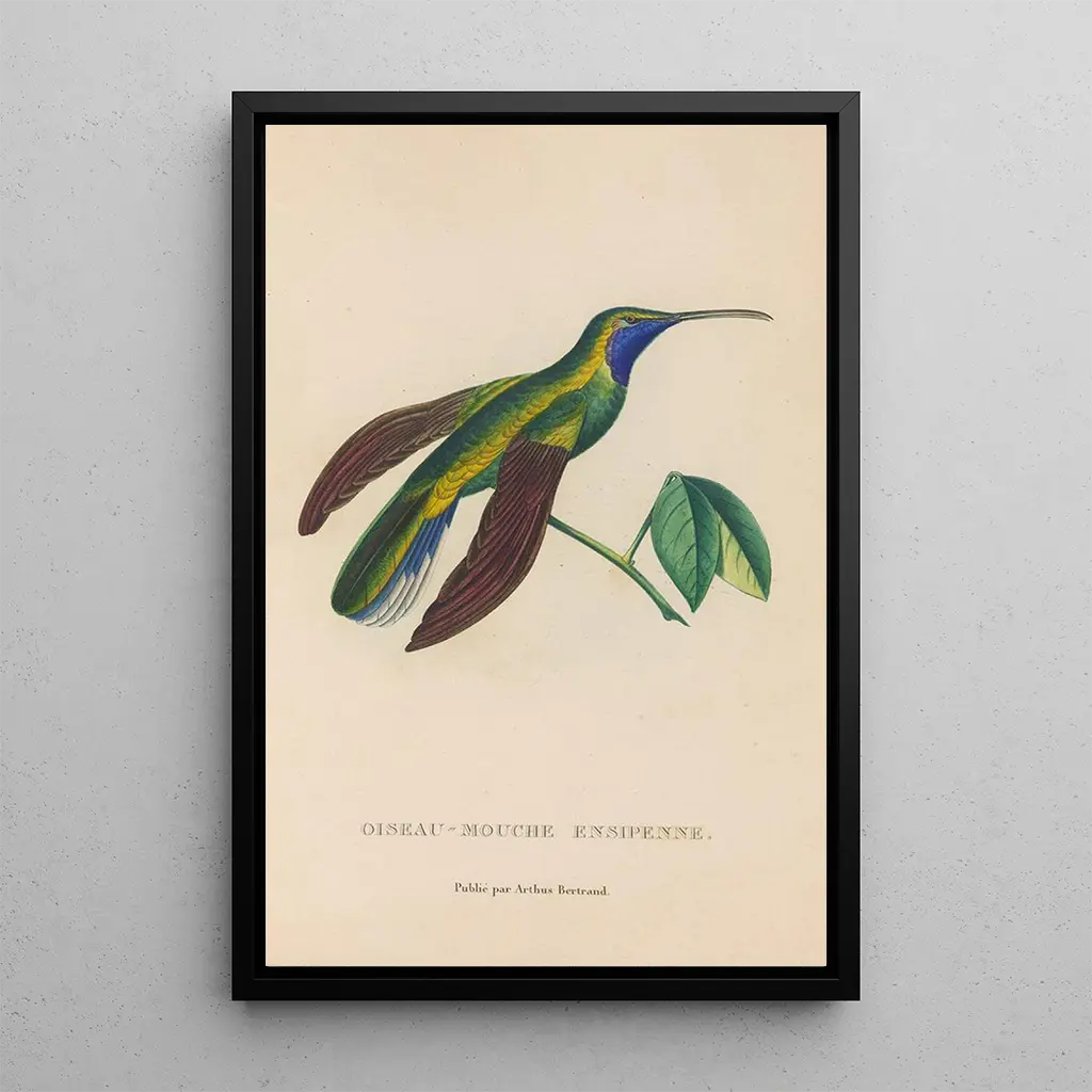 La impresión artística Historia natural de los colibríes Pl35 evoca un mundo vibrante donde los colibríes bailan al ritmo de las flores. Los colores brillantes de esta obra, que van desde verdes esmeralda hasta amarillos luminosos, crean una atmósfera alegre y ligera. La técnica de grabado utilizada por el artista permite capturar los detalles delicados de los plumajes y las posturas de los pájaros, haciendo que cada elemento parezca casi vivo. Se percibe una invitación a la contemplación, como si se pudiera escuchar el zumbido de las alas y sentir el aroma de las flores que los rodean.