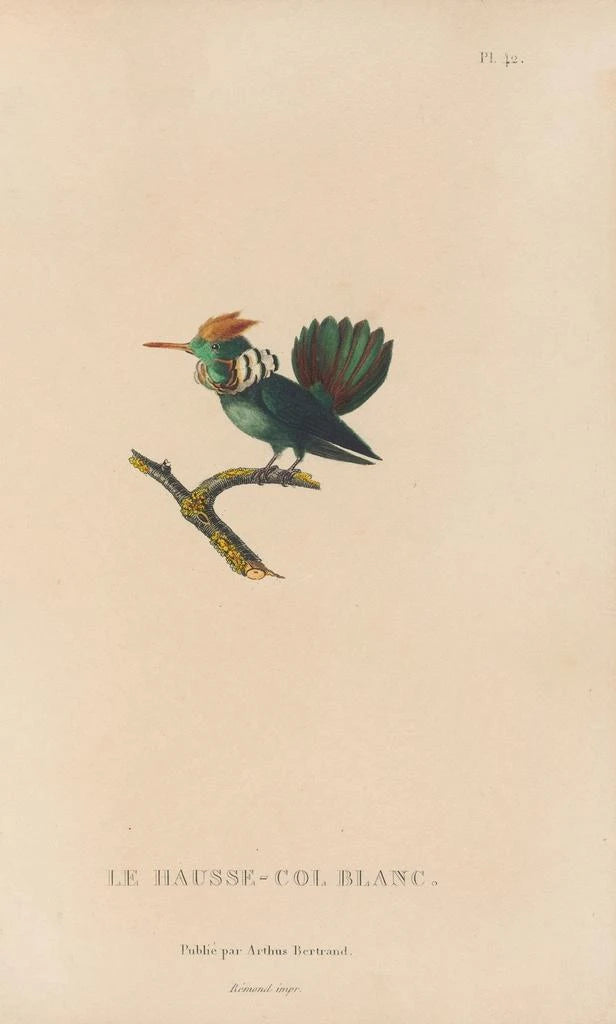 René Primevère Lesson, naturalista y ornitólogo del siglo XIX, desempeñó un papel esencial en el estudio de los pájaros, en particular de las especies exóticas. Su trabajo se inscribe en un período de descubrimiento científico y asombro ante la biodiversidad. Influenciado por las exploraciones de su época, supo combinar ciencia y arte, creando obras que son a la vez documentos científicos y piezas de arte. La historia natural de los pájaros-mosca, cuya impresión artística forma parte, testimonia su compromiso de capturar la belleza del mundo natural mientras contribuye al conocimiento ornitológico.