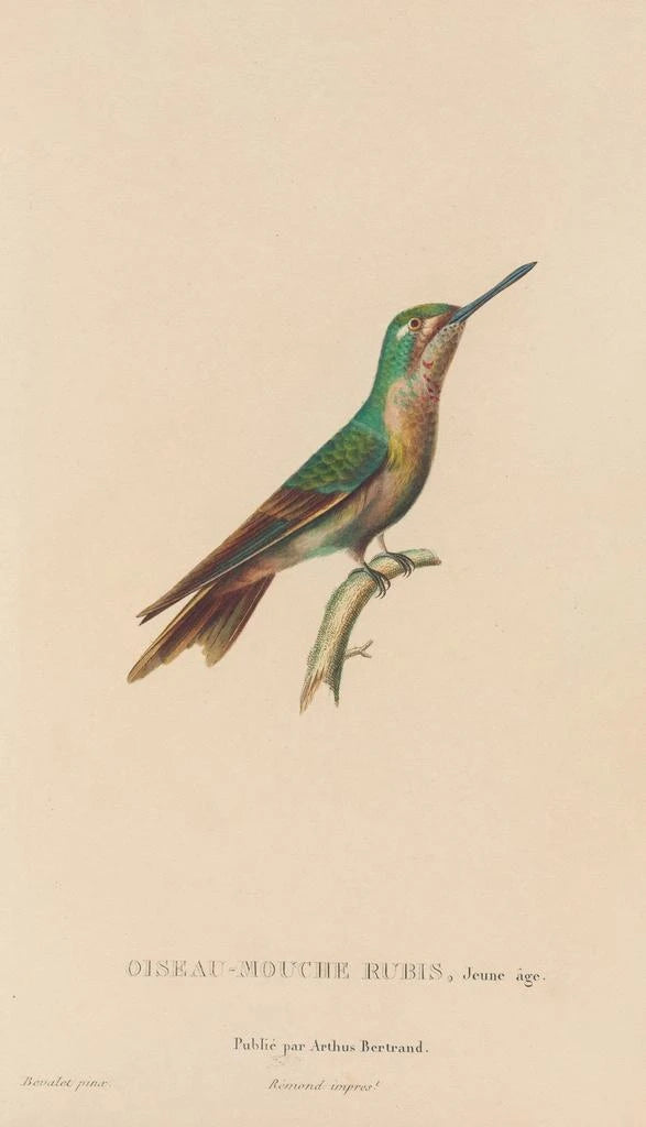 René Primevère Lesson, naturalista y ornitólogo del siglo XIX, supo marcar su época por sus estudios profundos de los pájaros. Influenciado por las exploraciones científicas de su tiempo, dedicó su vida a la clasificación y a la representación de las especies aviares. Su obra, historia natural de los colibríes, testimonia un interés creciente por la biodiversidad y la necesidad de preservarla. Lesson no solo contribuyó al enriquecimiento de los conocimientos ornitológicos, sino que también abrió el camino a un enfoque artístico de la ciencia, combinando observación rigurosa y estética.