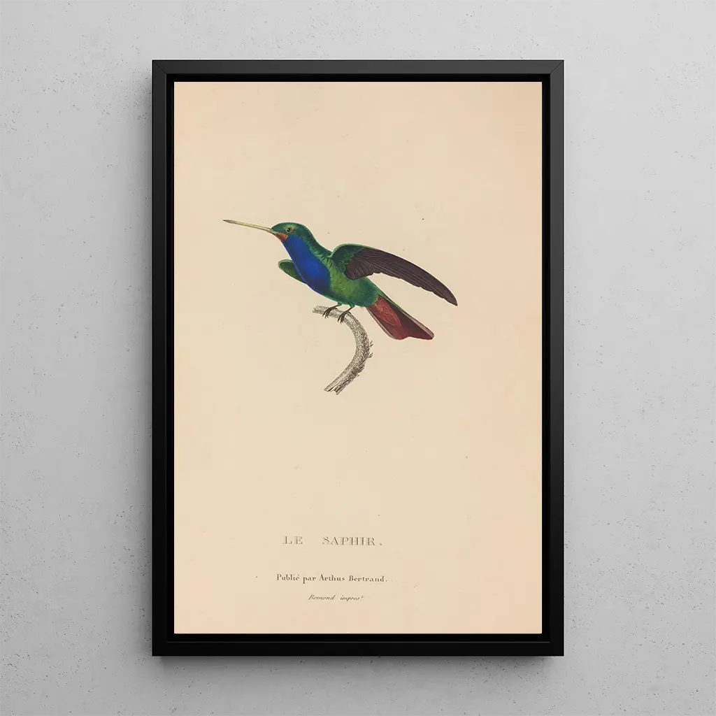 La impresión artística Histoire naturelle des oiseaux-mouches Pl56 ofrece una visión fascinante de la diversidad y la elegancia de los colibríes. Con colores vibrantes y detalles minuciosos, esta obra atrae la mirada e invita a la admiración. Los tonos brillantes de los plumajes, que van desde verdes esmeralda hasta rojos ardientes, se reproducen con una precisión notable. La técnica de grabado utilizada por René Primevère Lesson permite capturar la ligereza y el movimiento de estas criaturas delicadas, creando una atmósfera viva y dinámica. Cada ave parece casi lista para volar, añadiendo una dimensión poética a esta representación naturalista.