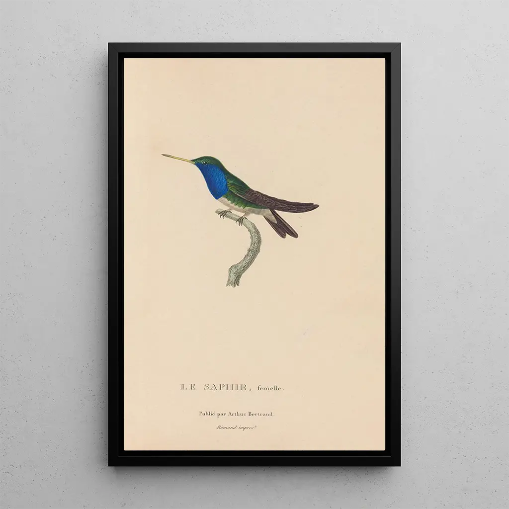 La impresión artística Histoire naturelle des oiseaux-mouches Pl57 revela otra faceta del esplendor aviar, destacando especies con plumajes fascinantes. Cada detalle está cuidadosamente representado, desde matices delicados hasta patrones complejos, creando una obra que cautiva la vista y la mente. La paleta de colores, que va desde azules profundos hasta amarillos brillantes, evoca la riqueza de la naturaleza. Gracias a una técnica de grabado refinada, René Primevère Lesson logra transmitir no solo la belleza exterior de los pájaros, sino también su esencia viva, invitando a una contemplación profunda de la fauna aviar.