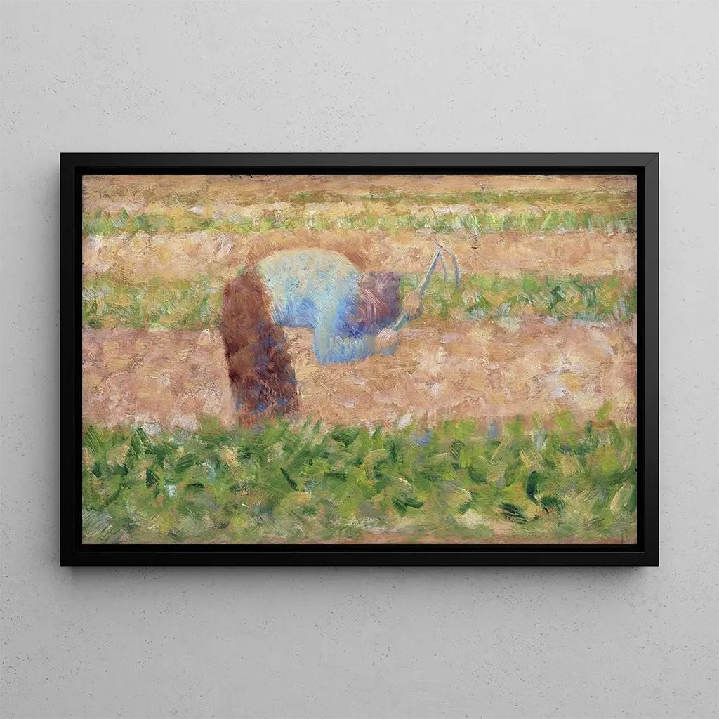 Hombre con una Azada : una obra emblemática de la vida rural En esta impresión artística de Hombre con una Azada, Georges Seurat nos sumerge en el universo pacífico de los trabajadores de la tierra. La tela, realizada con la técnica del puntillismo, se distingue por sus colores vibrantes y sus matices delicados. Las formas se dibujan sutilmente, creando una atmósfera a la vez serena y contemplativa. El personaje central, armado con su azada, parece encarnar la fuerza tranquila del campesino, mientras que el paisaje circundante evoca una naturaleza generosa y acogedora. Seurat logra capturar la esencia misma del trabajo diario, transformando una escena ordinaria en un momento de poesía visual. Georges Seurat : pionero del puntillismo y maestro de la luz Nacido en 1859, Georges Seurat es un artista francés que ha marcado la historia del arte por su enfoque innovador. Es el fundador del movimiento puntillista, que se basa en la aplicación de pequeñas pinceladas de color yuxtapuestas para crear efectos luminosos y vibrantes. Influenciado por las teorías científicas del color y las obras de los impresionistas, Seurat supo desarrollar un estilo único que abrió el camino a nuevas exploraciones artísticas. Su trabajo, aunque relativamente breve debido a su muerte prematura a los 31 años, tuvo un impacto considerable en el desarrollo del arte moderno, inspirando a numerosos artistas a lo largo de las décadas. Una adquisición decorativa con múltiples ventajas La impresión artística de Hombre con una Azada constituye una elección ideal para embellecer su interior, ya sea en una sala de estar, una oficina o un dormitorio. Su calidad de impresión fiel y su atractivo estético la convierten en una pieza central que atrae la mirada y suscita la reflexión. Al integrar este cuadro en su decoración, aporta un toque de elegancia y cultura, mientras celebra el trabajo y la naturaleza. Esta tela no solo es un elemento decorativo, sino también una invitación a la contemplación y a la apreciación de la belleza cotidiana.