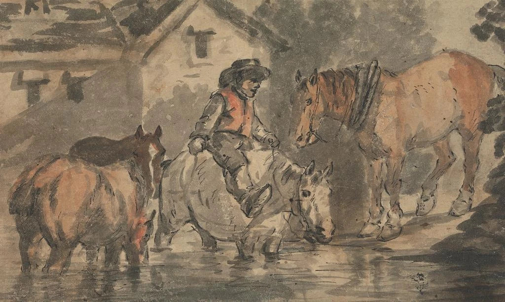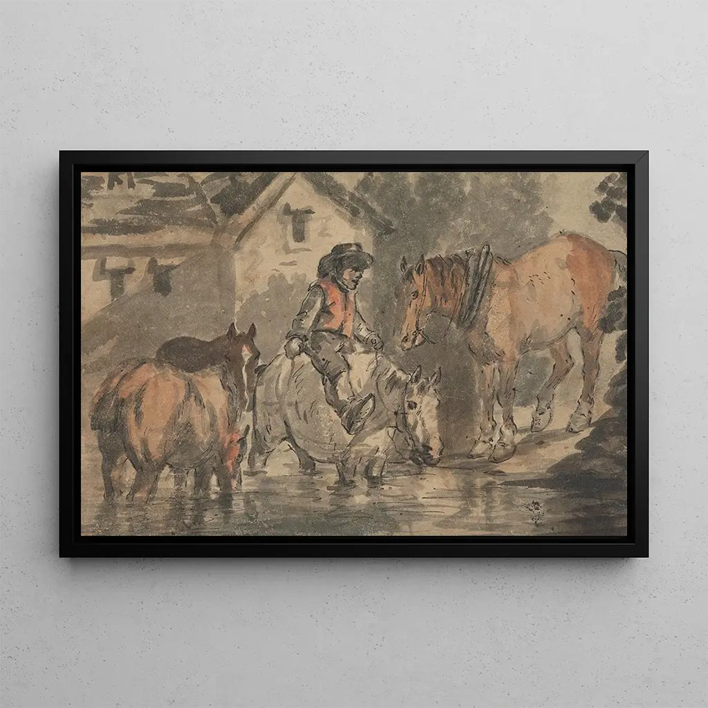 En "Hombre regando cuatro caballos", Conrad Gessner captura un momento de la vida rural con una precisión asombrosa. La tela representa a un hombre en interacción con sus caballos, ilustrando la simbiosis entre el hombre y el animal. Los colores terrosos y los detalles minuciosos de los caballos, así como la expresión concentrada del hombre, crean una atmósfera viva y dinámica. Gessner, por su habilidad para representar la naturaleza y el trabajo agrícola, nos sumerge en un universo donde la sencillez de la vida cotidiana es honrada, invitando a reflexionar sobre el vínculo entre el hombre y su entorno.
