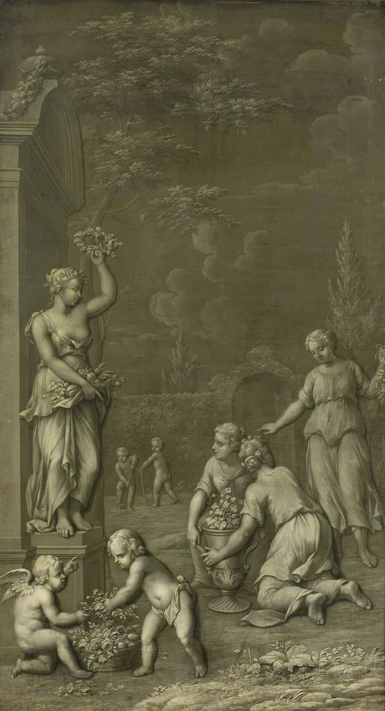 En "Hommage à Pomone", Hendrik Carr II nos sumerge en un universo donde la naturaleza y la mitología se encuentran. La composición es rica en detalles, con colores vibrantes que evocan la frescura de las frutas y la dulzura de las flores. La técnica del artista, que combina hábilmente el claroscuro, crea una atmósfera a la vez serena y dinámica. Los personajes, rodeados de vegetación exuberante, parecen celebrar la fertilidad y la abundancia, invitando al espectador a una contemplación meditativa de esta escena bucólica.