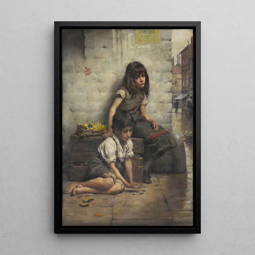 En "Orfános", Thomas Benjamin Kennington captura con una sensibilidad conmovedora la inocencia perdida de los niños. La composición destaca a dos jóvenes huérfanos, cuyos rostros reflejan melancolía, sumidos en una atmósfera de tristeza y soledad. Los colores suaves, dominados por tonos terrosos y matices pastel, crean un contraste impactante con la intensidad emocional de la escena. La técnica de impresión artística al óleo, dominada por Kennington, permite reproducir las texturas de la ropa y la luz suave que ilumina los rostros de los niños, añadiendo una dimensión casi táctil a la obra. Este cuadro invita a reflexionar sobre la fragilidad de la infancia y los desafíos que enfrentan estas jóvenes almas.