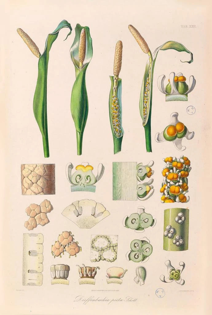 "Icones Aroidearum Pl26" de Heinrich Wilhelm Schott es una obra fascinante que destaca la diversidad de las especies de aráceas. Esta ilustración se caracteriza por su precisión y sus colores vibrantes, que rinden homenaje a la belleza de las plantas tropicales. Los detalles minuciosos de las hojas y las flores, combinados con una paleta rica en verdes profundos y matices delicados, crean una atmósfera viva y acogedora. Schott, con su talento, logra capturar la esencia misma de estas plantas, invitando al espectador a apreciar la complejidad y la esplendor de la naturaleza.