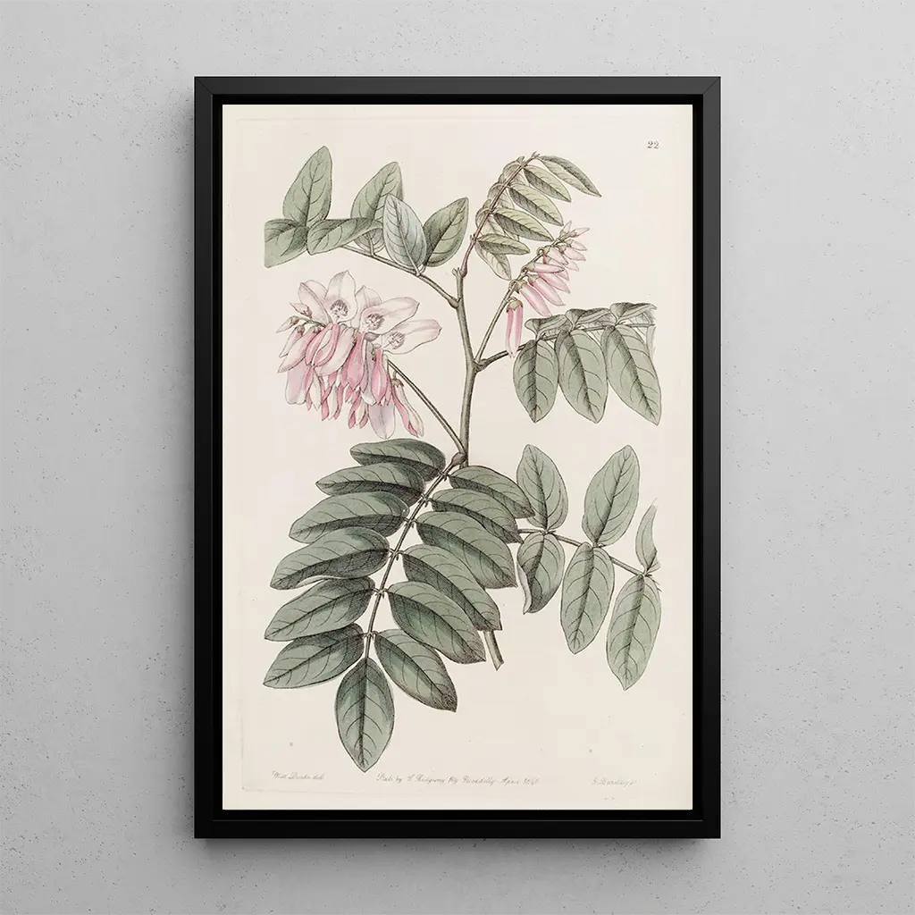 En esta impresión artística de La graciosa indigo, Sydenham Edwards nos ofrece una visión cautivadora de una planta con tonos vibrantes. Las tonalidades de indigo se combinan armoniosamente, creando un efecto visual que evoca ligereza y fluidez. La composición, cuidadosamente equilibrada, resalta las formas delicadas de las hojas y las flores, dejando entrever una atmósfera de serenidad. Cada detalle se reproduce con una precisión que testimonia el talento de Edwards, invitando al espectador a maravillarse ante la belleza de la naturaleza.