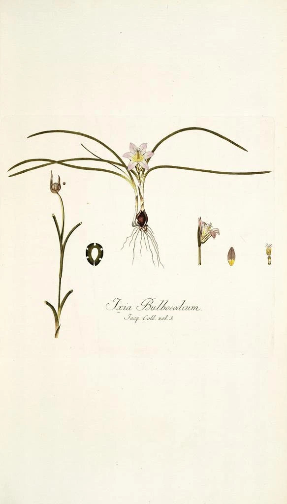 Nikolaus Joseph Freiherr von Jacquin, botánico y artista del siglo XVIII, marcó su época con sus contribuciones a la botánica y al arte. Sus viajes por el mundo le permitieron descubrir e ilustrar especies vegetales raras, convirtiéndolo en un pionero en el campo de la impresión artística botánica. Su estilo, que combina precisión científica y sensibilidad artística, es representativo del espíritu de las Luces. "Ixia bulbocodium" refleja su compromiso de rendir homenaje a la belleza de la naturaleza mientras enriquece el conocimiento botánico de su tiempo.