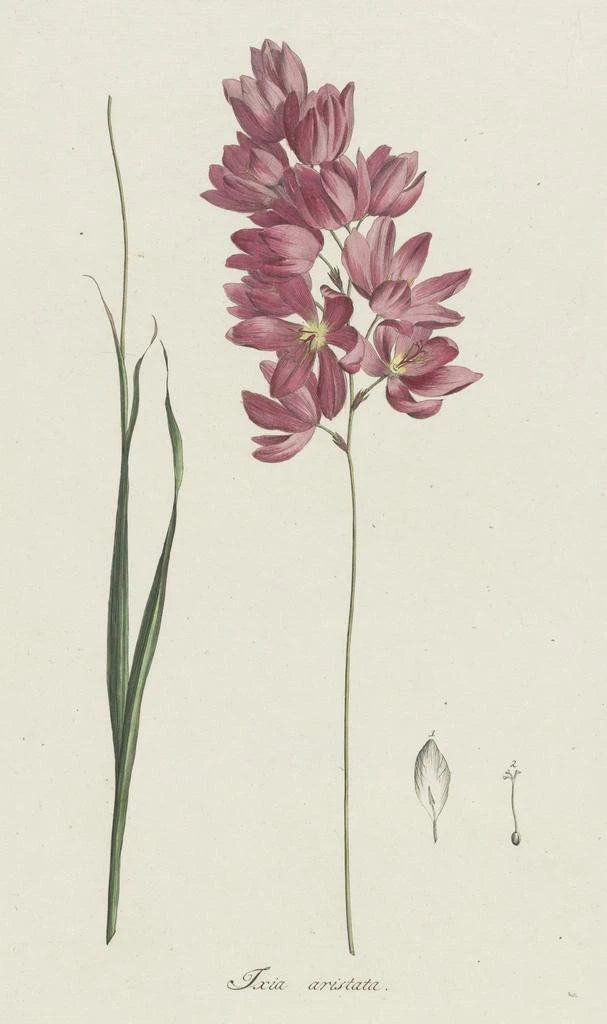 La impresión artística Ixia patens Aiton nos sumerge en un mundo vibrante donde los tonos brillantes de las flores se mezclan con la suavidad de las formas. Hendrik Schwegman, con su técnica minuciosa, logra capturar la esencia misma de esta planta, revelando matices de amarillo, naranja y rojo que parecen bailar bajo la luz. La atmósfera de la obra evoca una sensación de alegría y vitalidad, como si cada pétalo estuviera animado por una vida propia. La composición, equilibrada y armoniosa, invita al espectador a explorar los detalles delicados de esta flor, mientras ofrece una vista general cautivadora.
