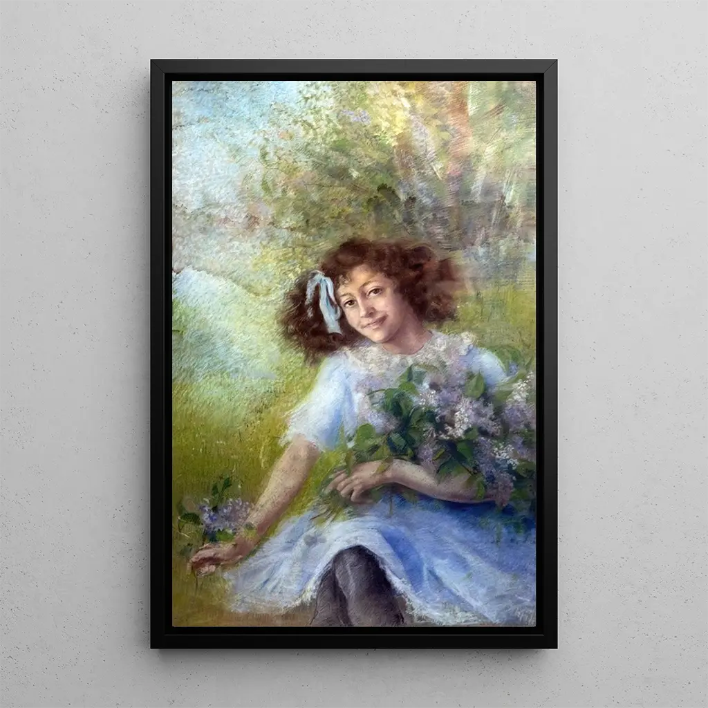 En "Jeune fille con ramo", Luce Boyals nos ofrece una visión poética de una joven rodeada de flores vibrantes. Los colores vivos y los detalles minuciosos de los pétalos contrastan con la suavidad del rostro de la joven, creando una armonía visual cautivadora. La luz natural que baña la escena acentúa la frescura y la vitalidad del conjunto, mientras que la postura delicada de la joven evoca una gracia atemporal. Este cuadro es una verdadera oda a la belleza de la naturaleza y a la juventud.
