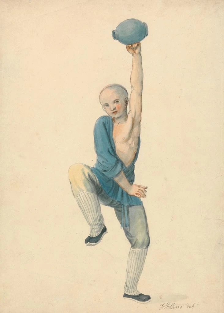 En esta obra cautivadora, Thomas Stothard nos presenta un joven chino, cuyo mirada soñadora y postura delicada evocan una belleza frágil. Los colores suaves y pastel, mezclados con toques de luz, crean una atmósfera serena y contemplativa. La técnica de Stothard, que combina acuarela y grabado, da vida a esta impresión artística, haciendo que cada detalle, desde la tela del vestido hasta la sonrisa sutil del joven, tenga una gran finura. La obra parece invitar al espectador a sumergirse en un mundo de dulzura y evasión, donde la inocencia es puesta en valor.