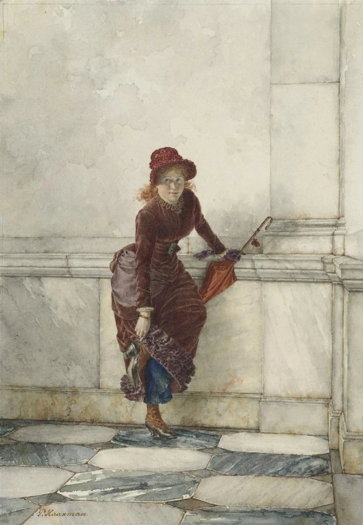 Dans cette impresión artística de l'œuvre "Jeune femme debout appuyée contre un mur", l'artiste Pieter Haaxman capture un moment de tranquillité et de réflexion. La composition met en avant une jeune femme, élégamment vêtue, qui semble perdue dans ses pensées. Les couleurs douces et chaudes, mêlant des tons de terre et de pastel, créent une atmosphère apaisante. La lumière douce qui éclaire son visage accentue la délicatesse de ses traits, tandis que le mur en arrière-plan ajoute une dimension de profondeur à la scène. Cette œuvre invite à une contemplation silencieuse, comme si l'on pouvait partager un instant de vie avec la protagoniste.